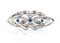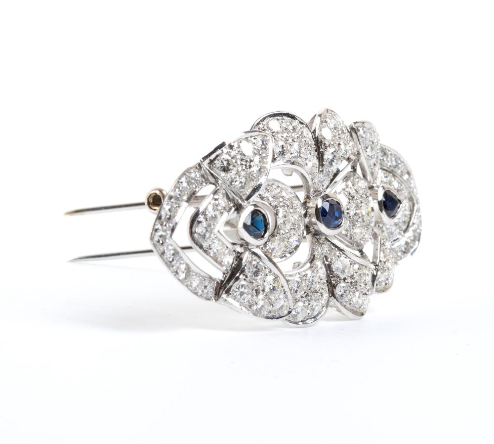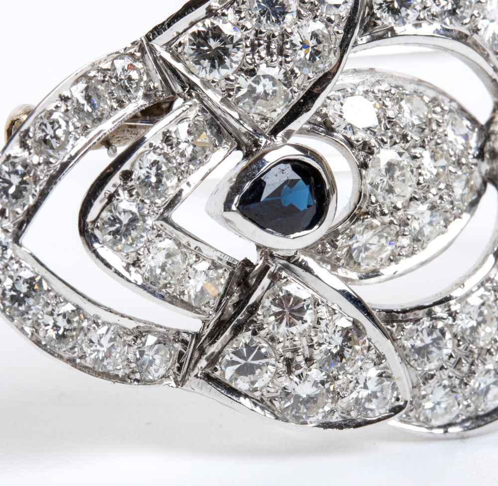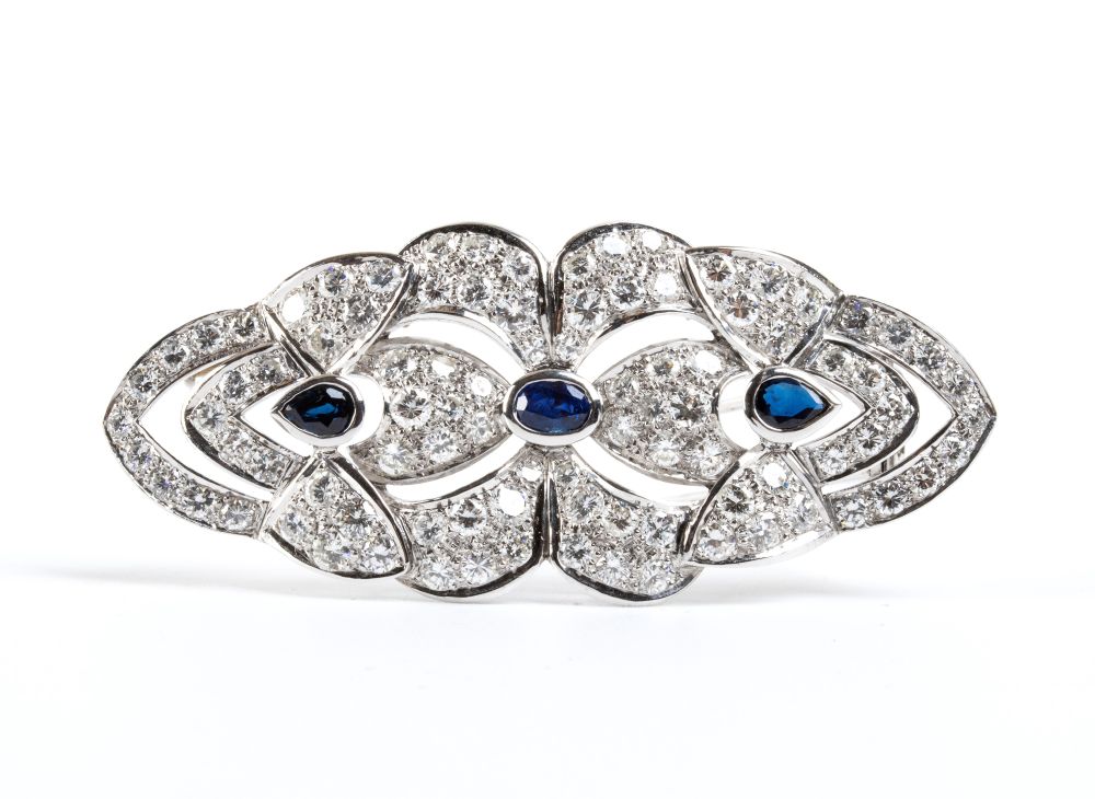 a forma di losanga traforata, con tre zaffiri e motivo di nastri in diamanti.