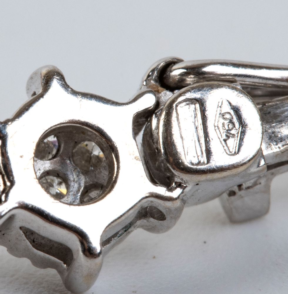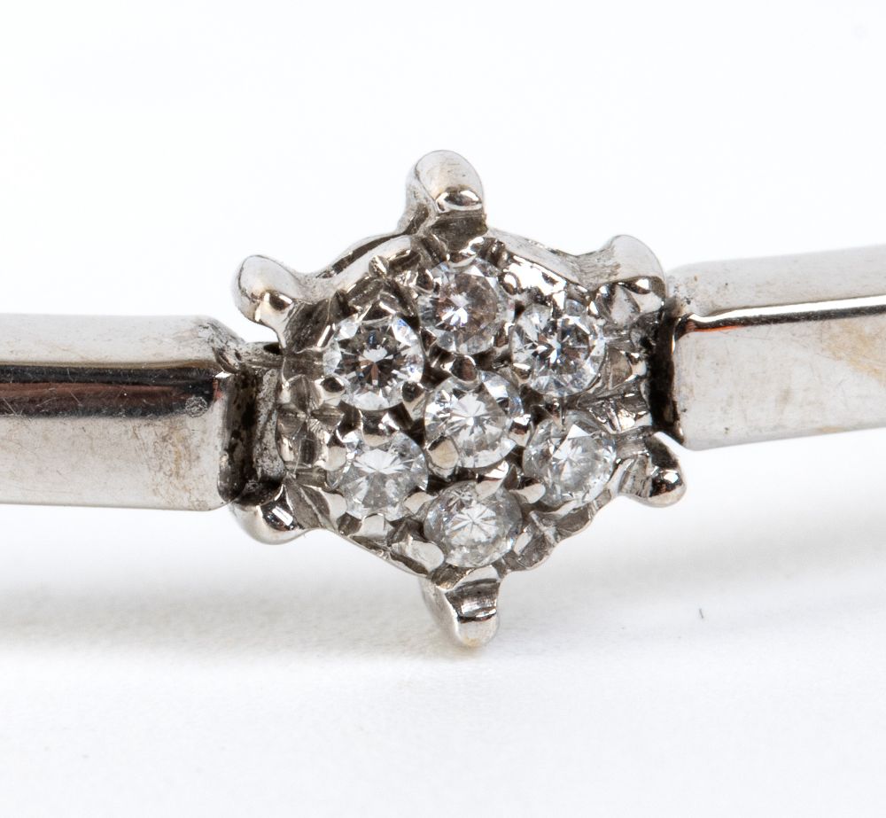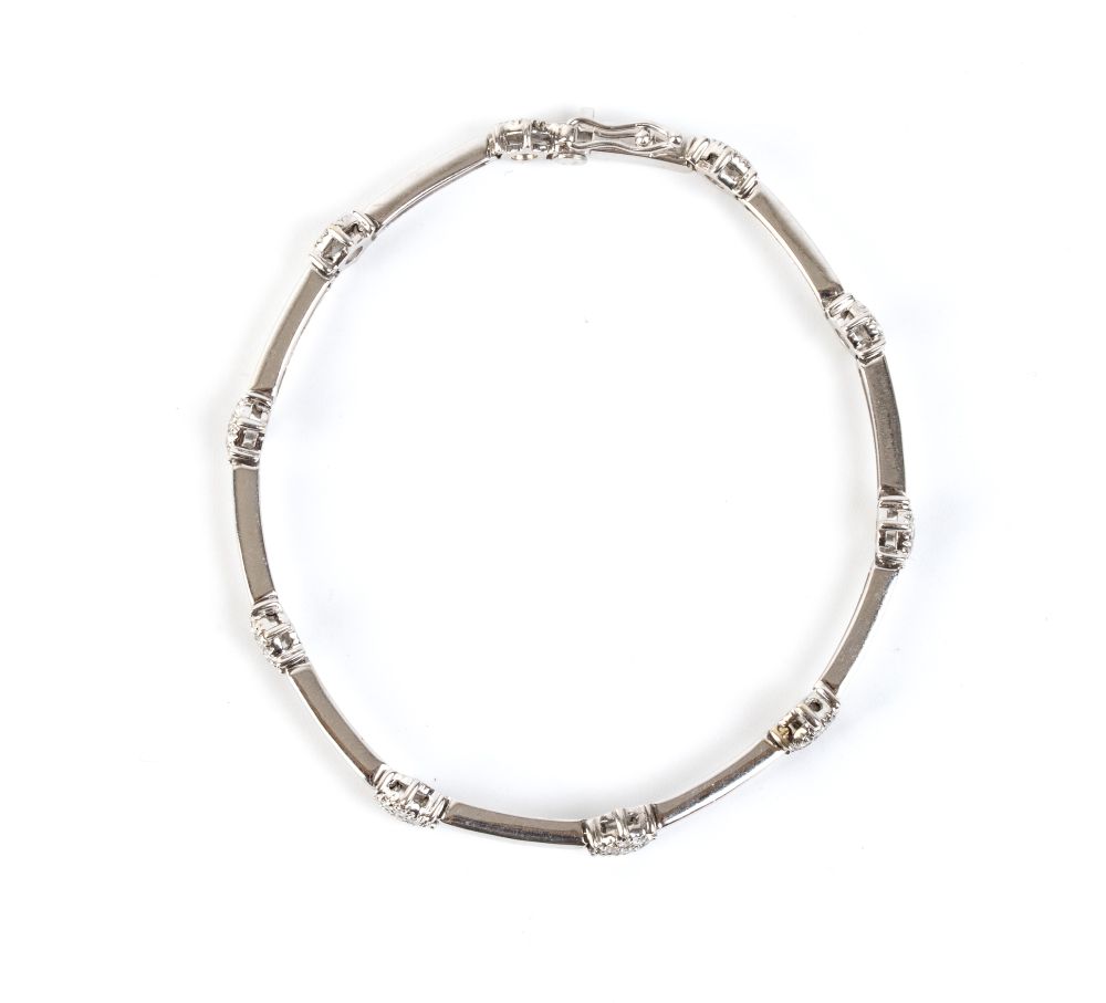 in oro bianco 18k, in linea di elementi a barretta separati da piccoli motivi a fiore in diamanti taglio brillante, stimati per un peso totale di circa 0.80 ct, colore G-H, purezza VS.