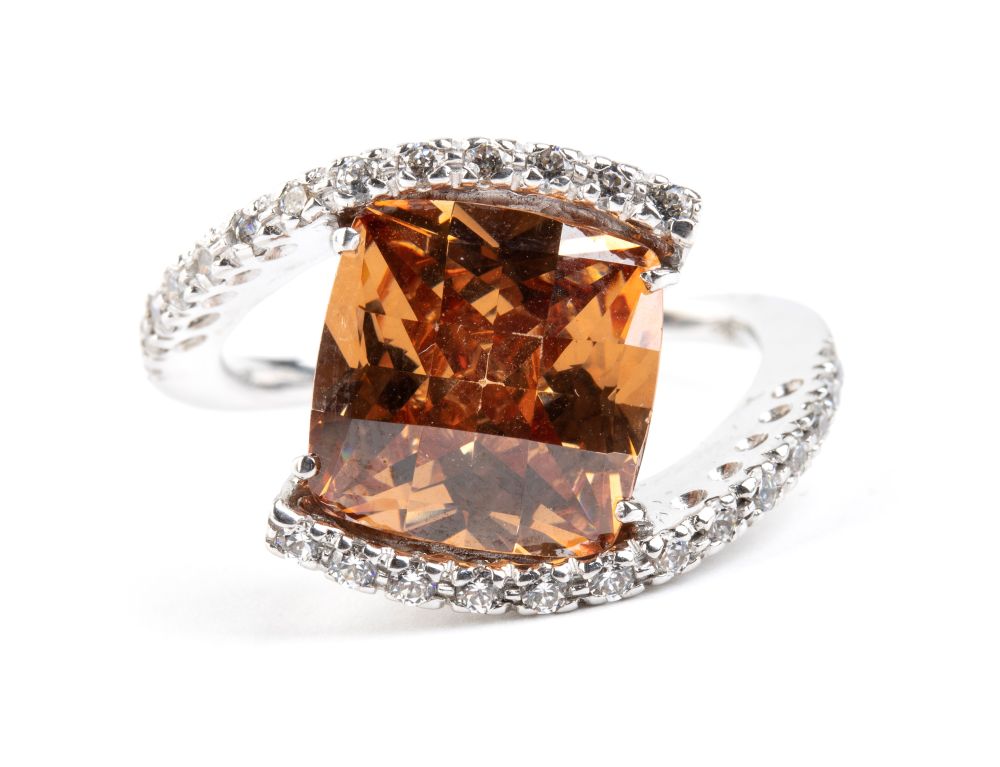 in oro bianco 18k, incastonato con quarzo citrino affiancato da nastri in paste vitree.