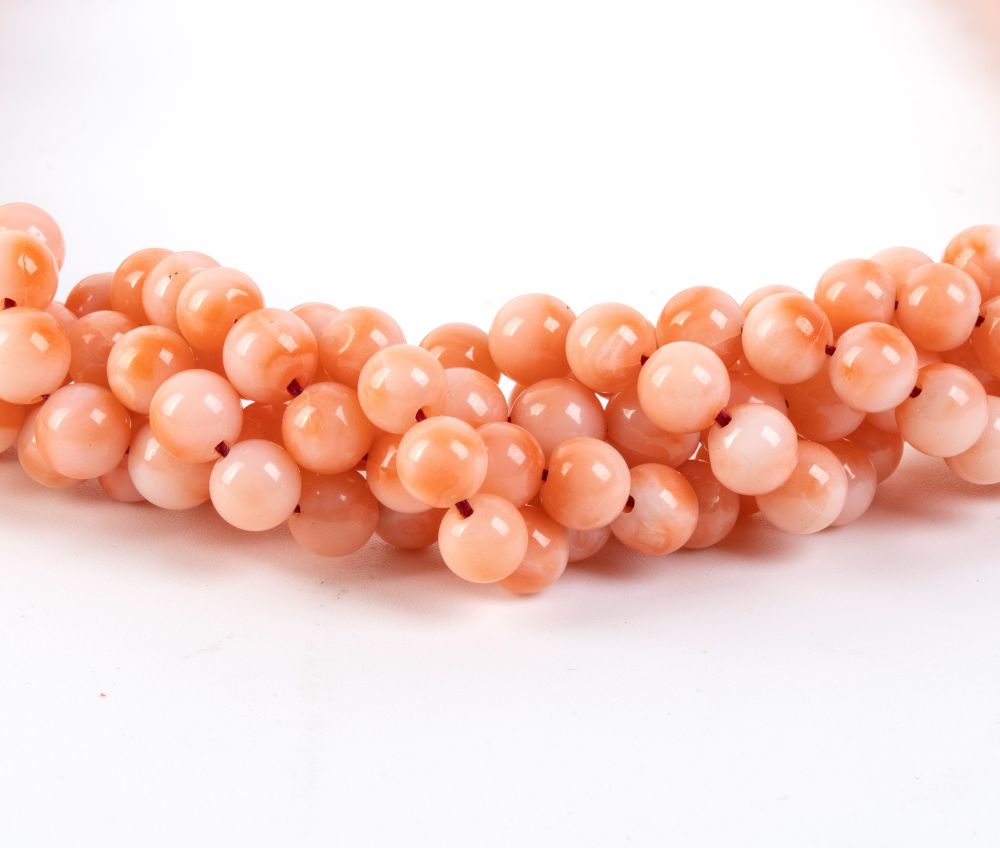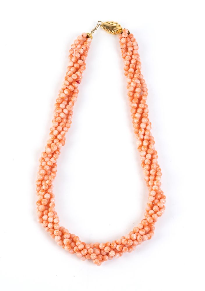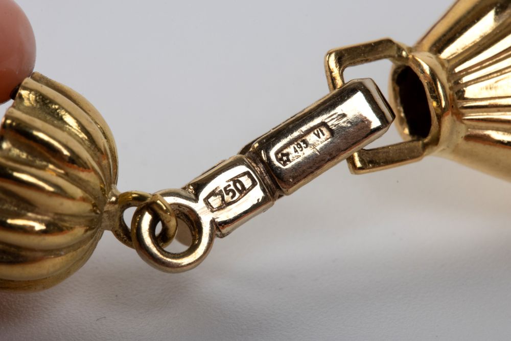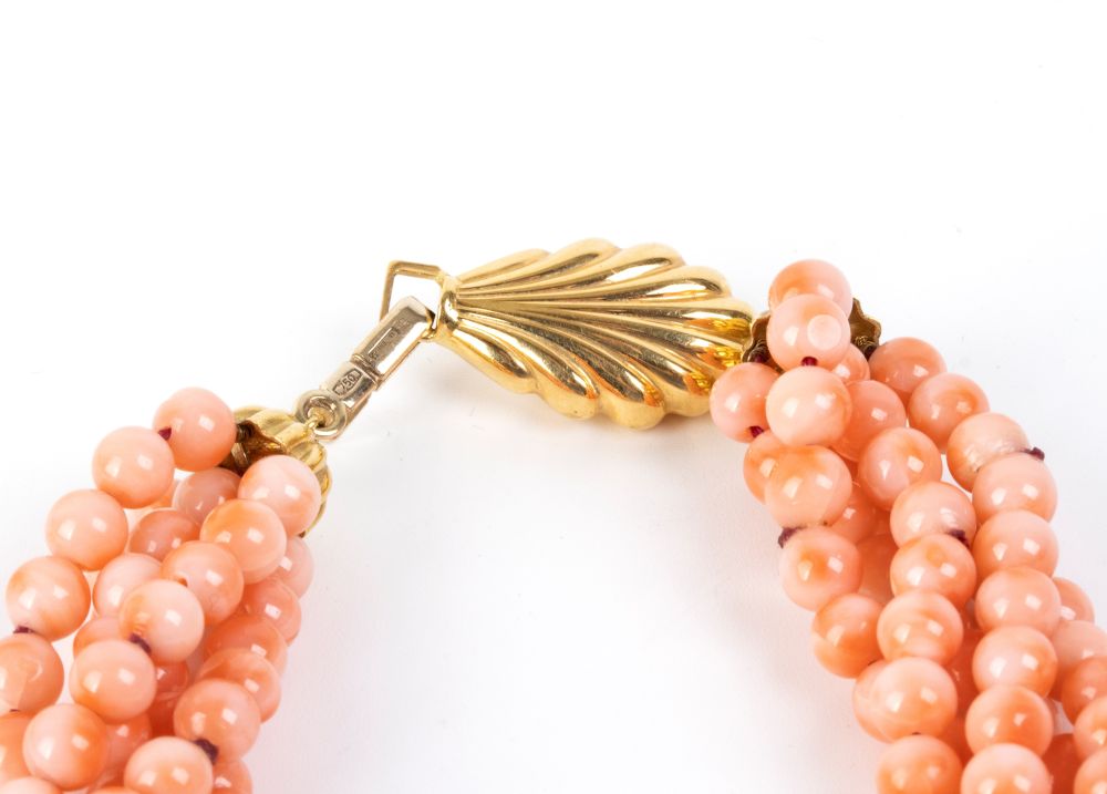 Fermezza a forma di conchiglia, in oro giallo 18k, e nastro di corallo Deep Sea multifili (Corallum sp. Nov.).