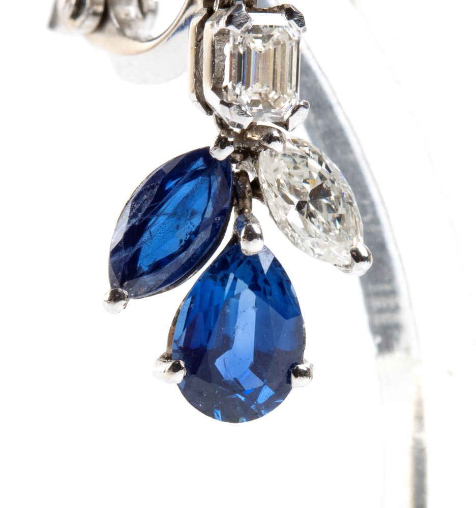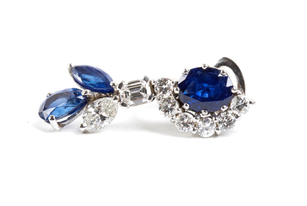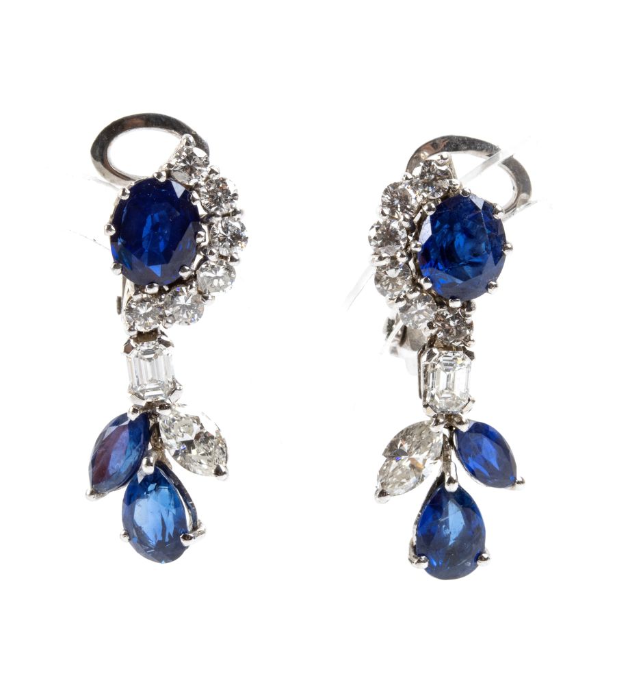 Paio di orecchini pendenti in oro, zaffiri e diamanti