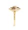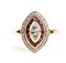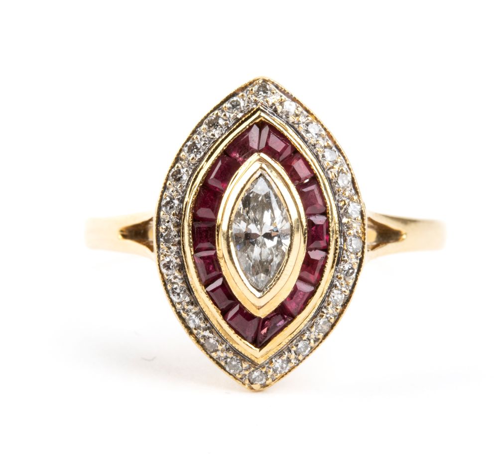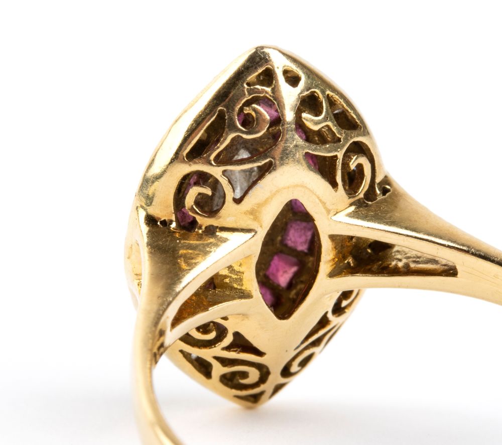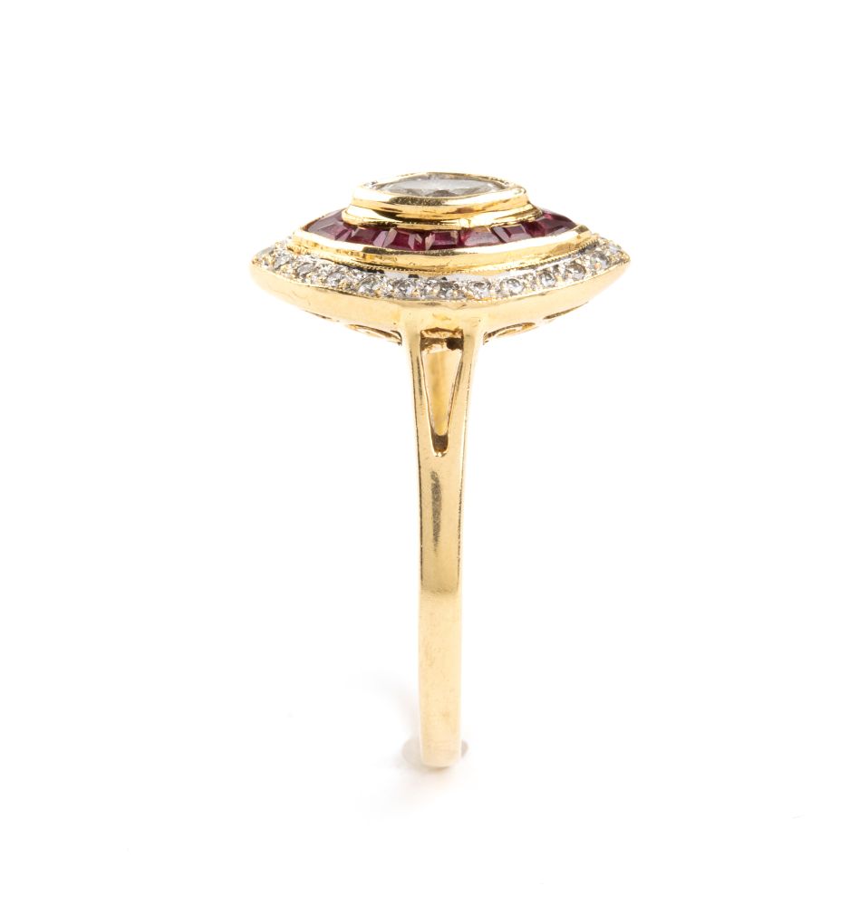 in oro giallo 18k, incastonato con navetta di diamante tra cornice di rubini e diamanti taglio brillante.