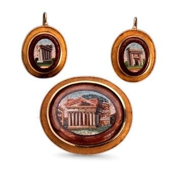 Demi parure composta da spilla e orecchini con montatura in oro giallo 14K Italia, seconda metà XIX secolo