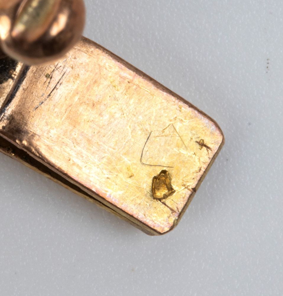 Oxidation, scuffs and scratches to the metal consistent with age and normal wear. Apparently not hallmarked, verified with xrf spectrometer, is guaranteed to be gold at approximate finess of 14k.