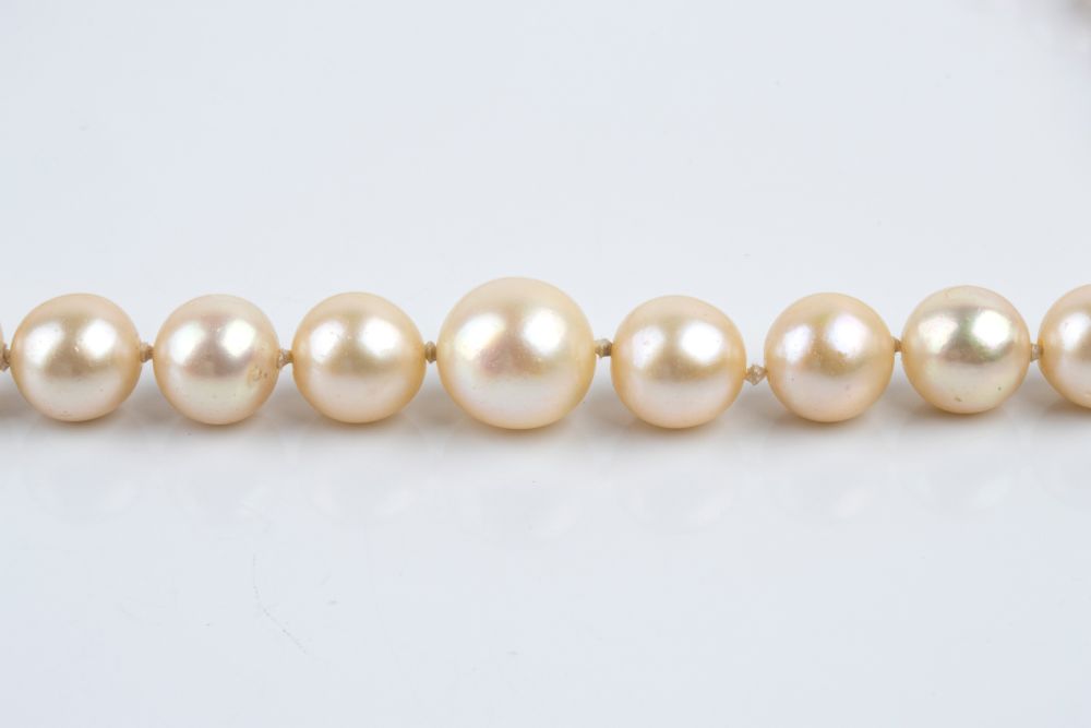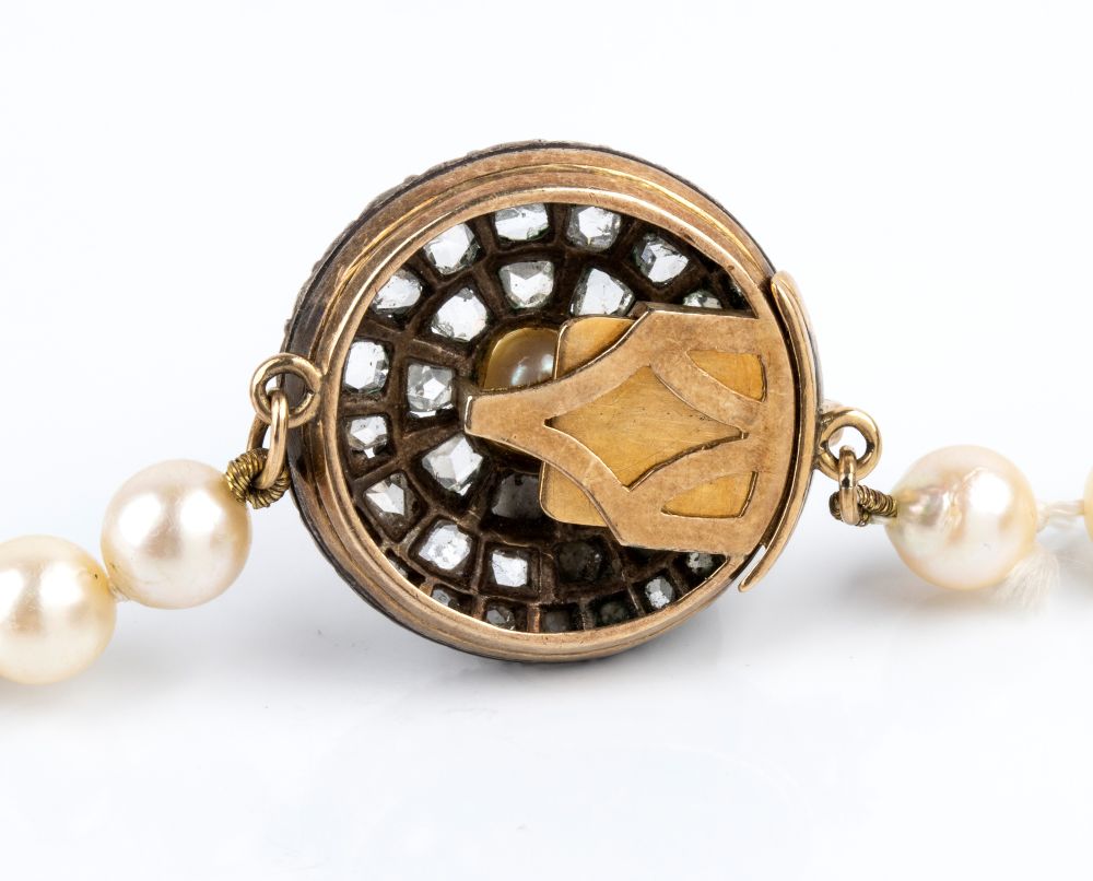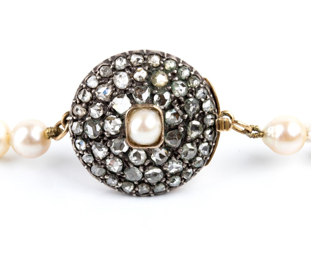ad un filo di perle coltivate d'acqua salata disposte in gradazione, fermezza in oro giallo ed argento incastonata con pavé di diamanti taglio a rosa.