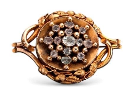 Spilla vittoriana inglese in oro, cristallo di rocca e paste vitree fine XIX secolo