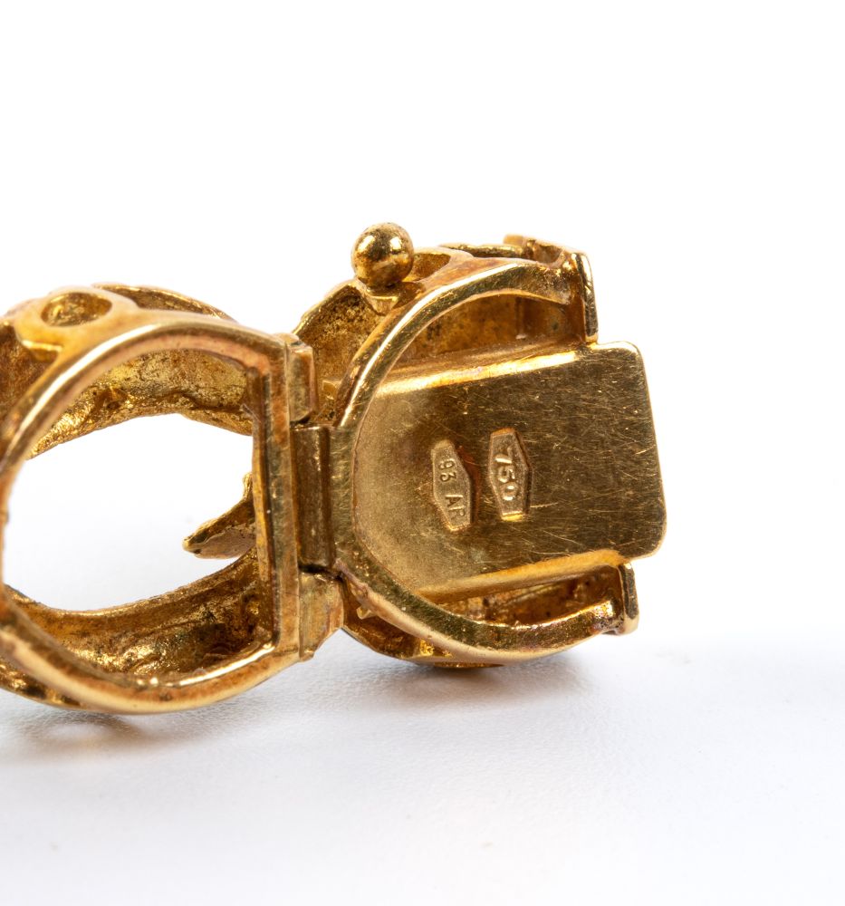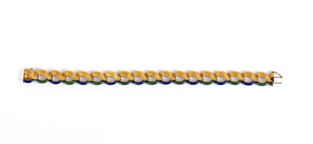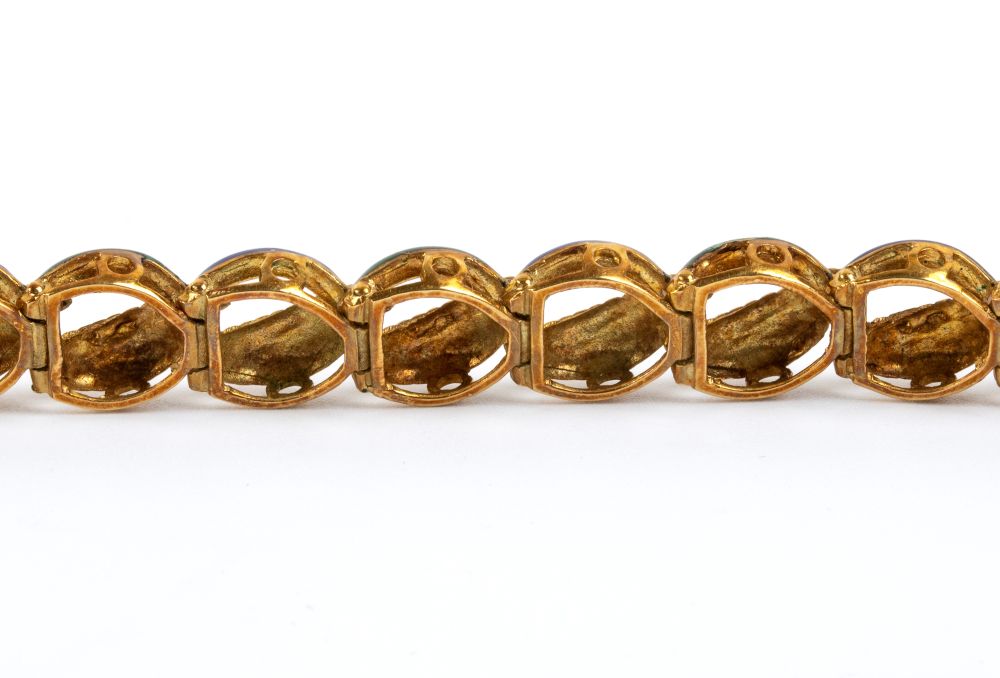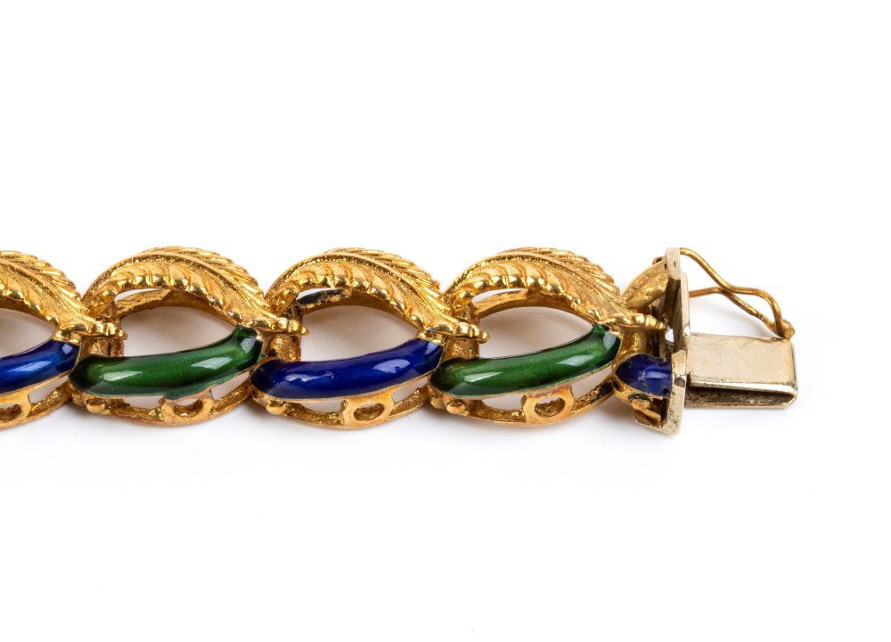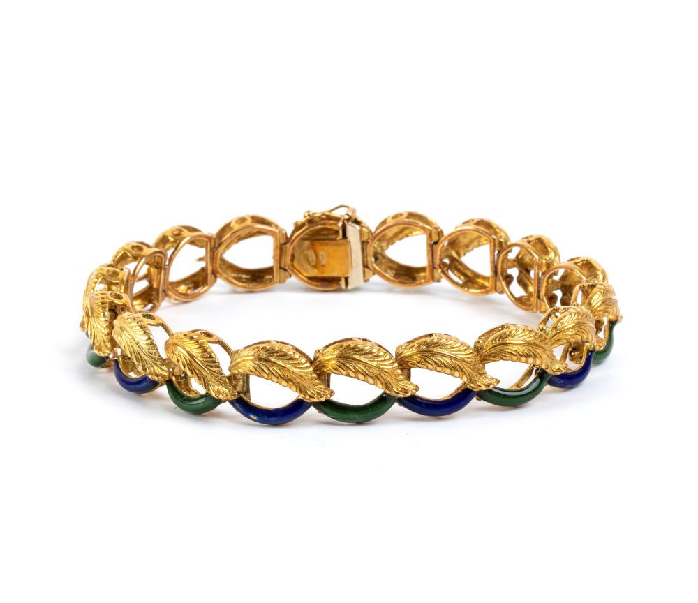 in oro giallo 18k, con maglie ad anello con motivo di foglie e decori in smalto.