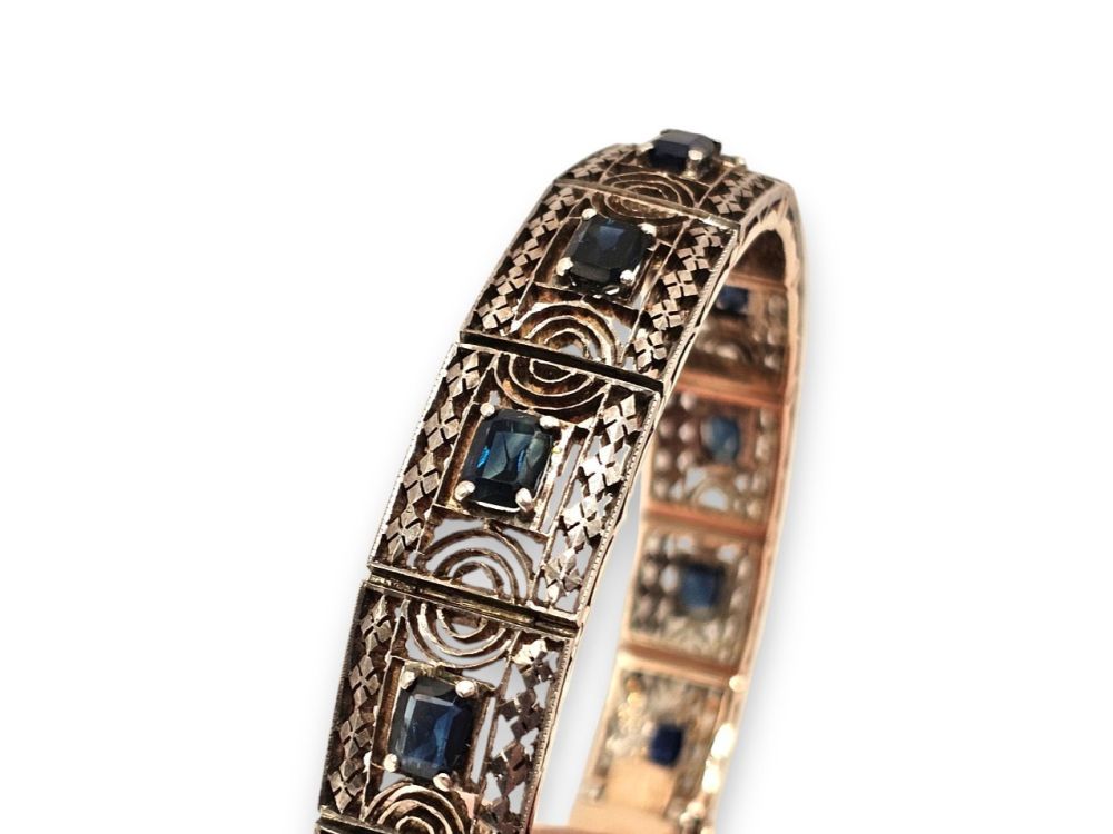 in oro rosa ed argento a maglie geometriche traforate, incastonate con zaffiri.