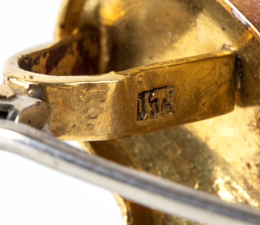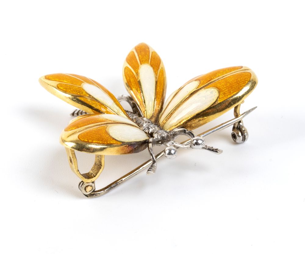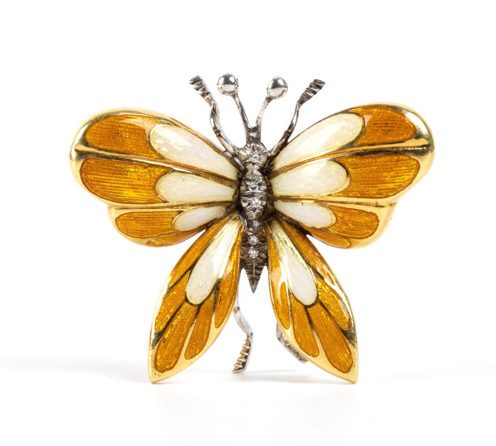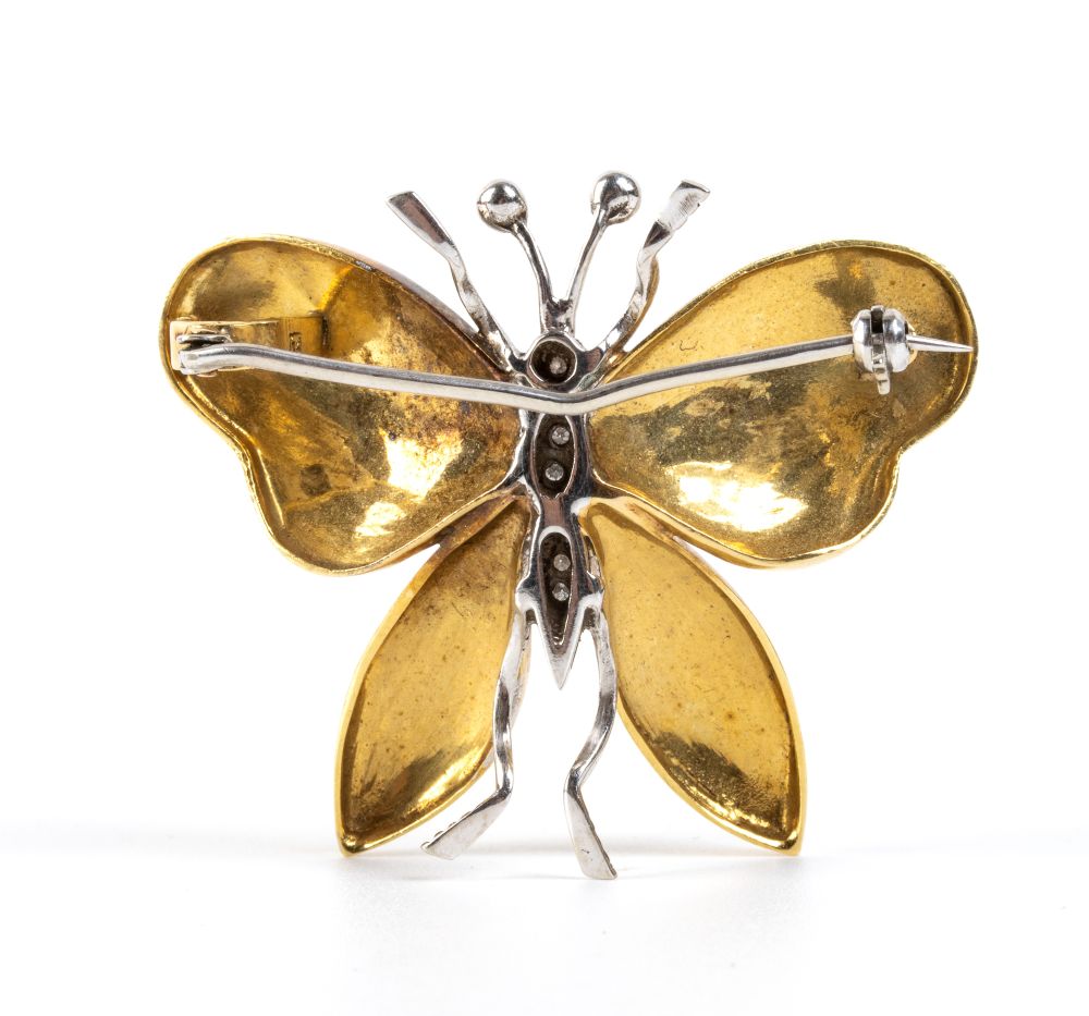 raffigurante una farfalla realizzata in due colori d'oro, le ali decorate con smalti policromi, corpo in pavé di diamanti taglio huit-huit, di circa 0.06 ct, colore G-H, purezza VVS-VS.