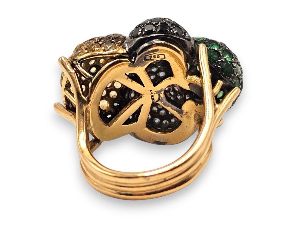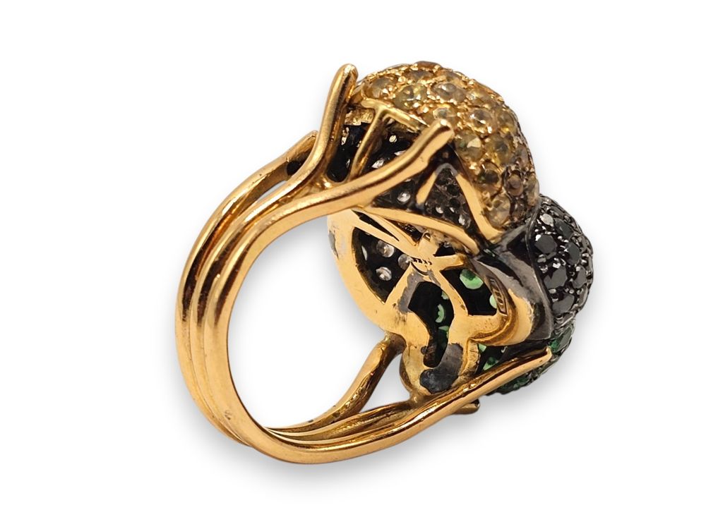 in oro 18k, parte superiore con motivo di quattro sfere incastonate rispettivamente con pavé di peridoti, diamanti neri, quarzi citrini, diamanti taglio brillante stimati per un peso totale di circa 2.00 ct.