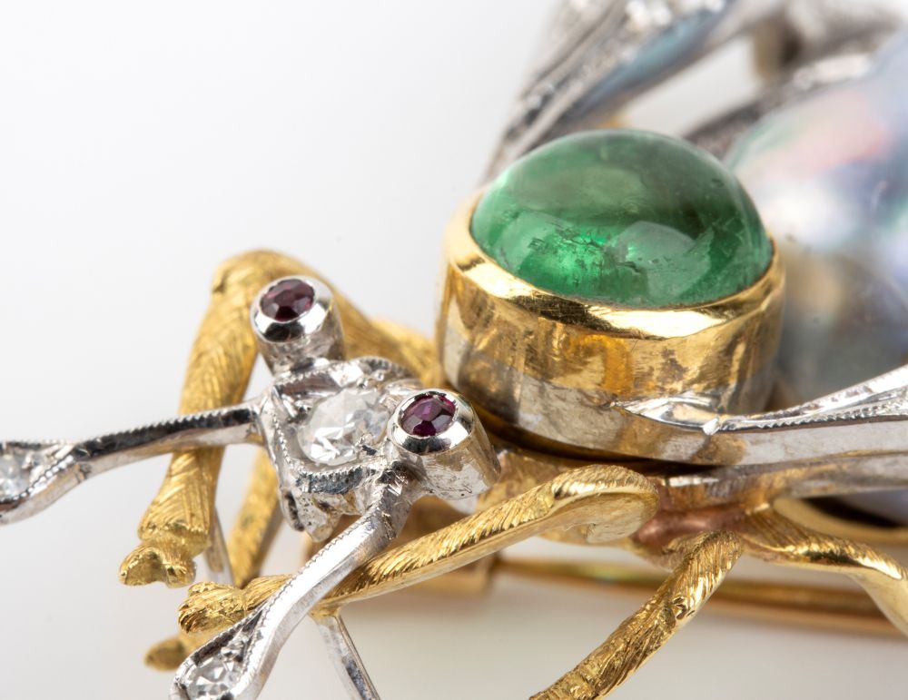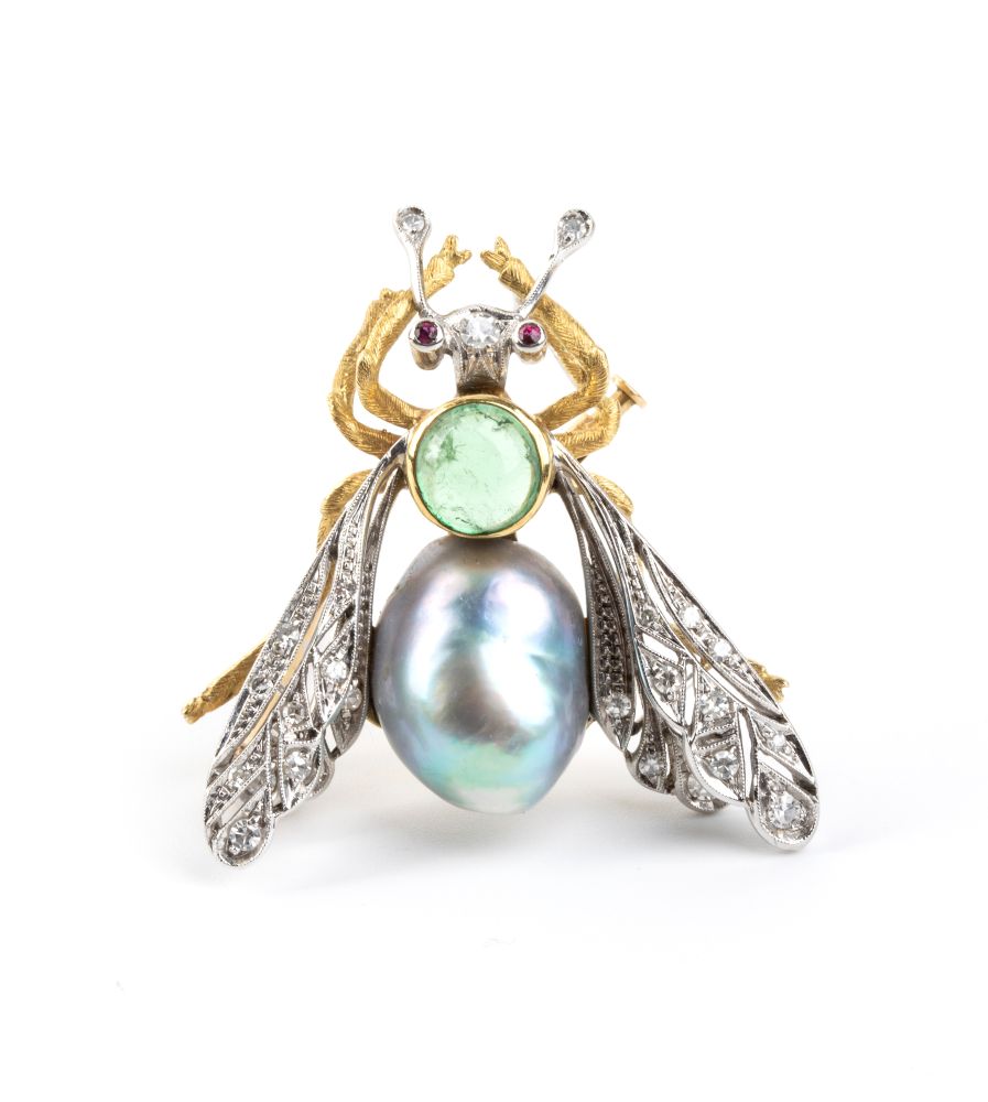 Spilla insetto in oro con tormalina, perla, diamanti e rubini