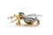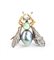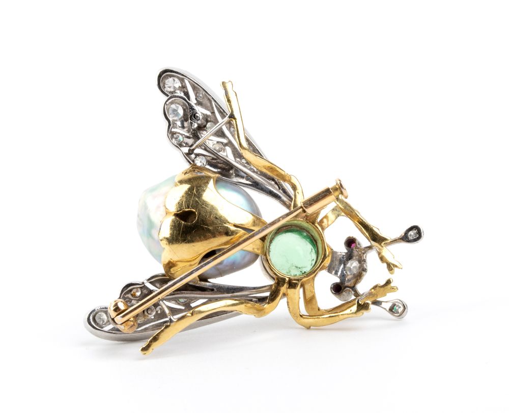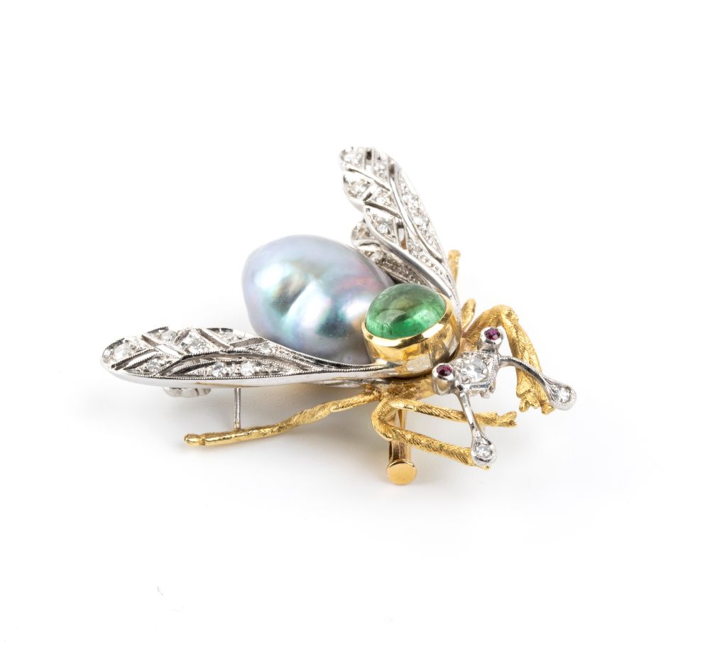 in due colori d'oro, corpo in perla scaramazza e cabochon di tormalina, occhi in piccoli rubini e ali impreziosite con diamanti taglio huit-huit.