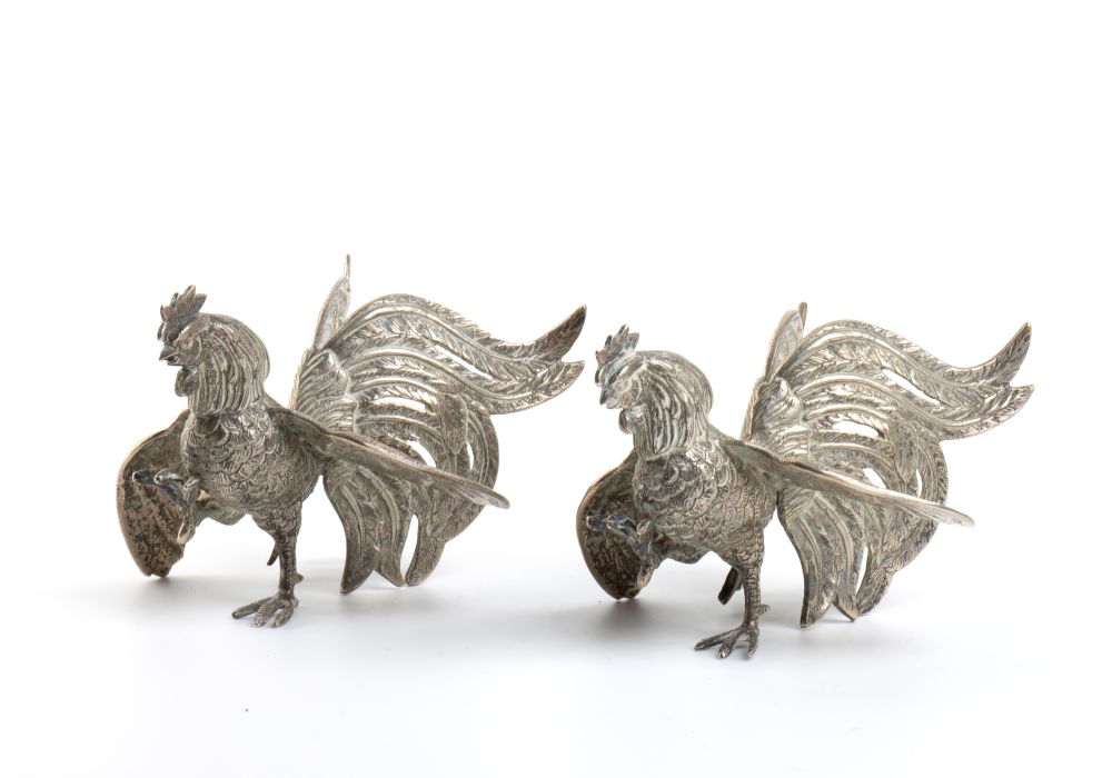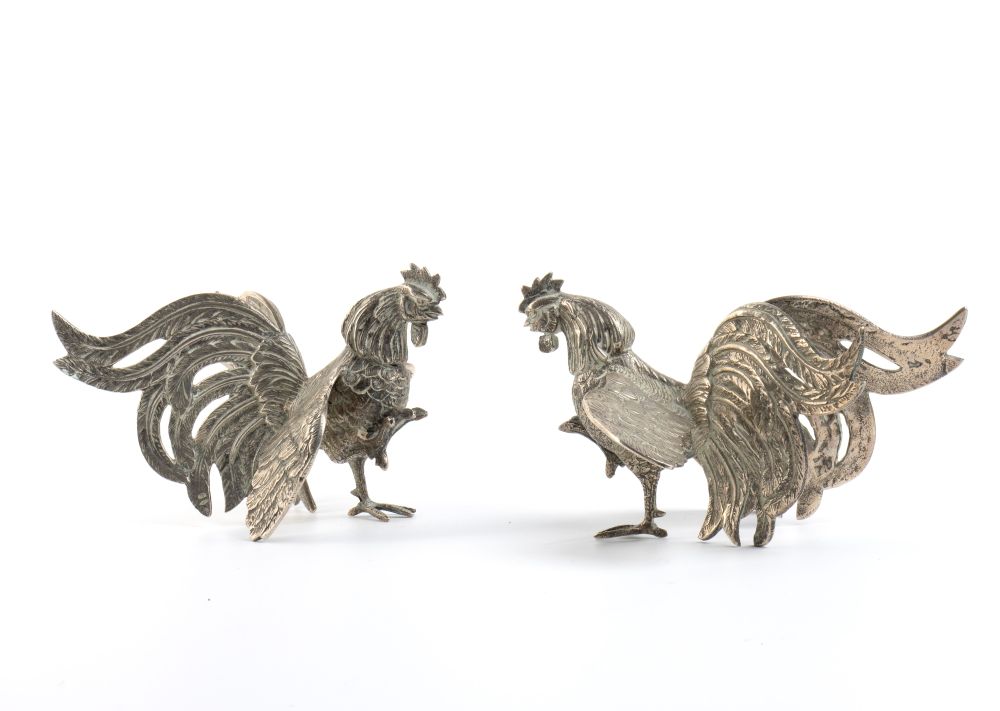 Coppia di galli in argento Italia, XX secolo Altezza x larghezza x profondità: 9,5 x 10,5 x 14 cm. Peso complessivo: 710 gr.