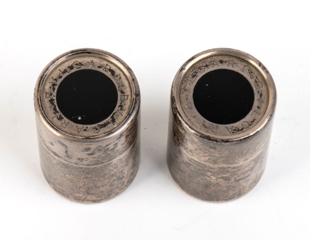 BULGARI Coppia di porta fiammiferi in argento Italia, XX secolo Altezza x diametro: 6 x 3,6 cm. Peso totale: 219 gr.