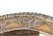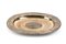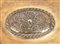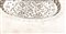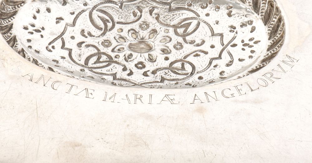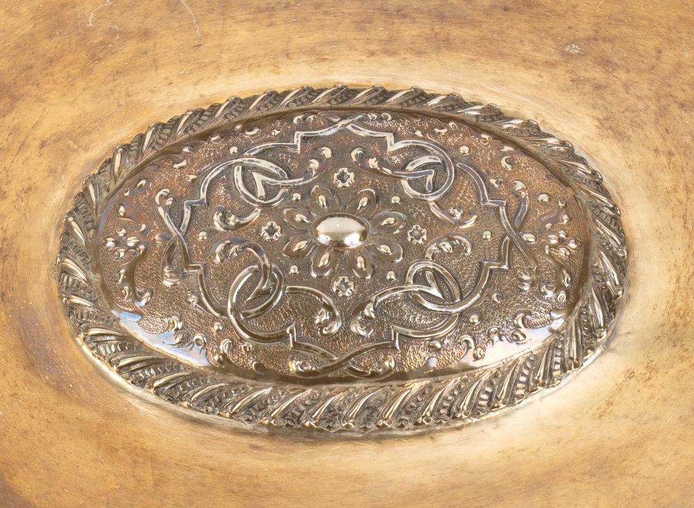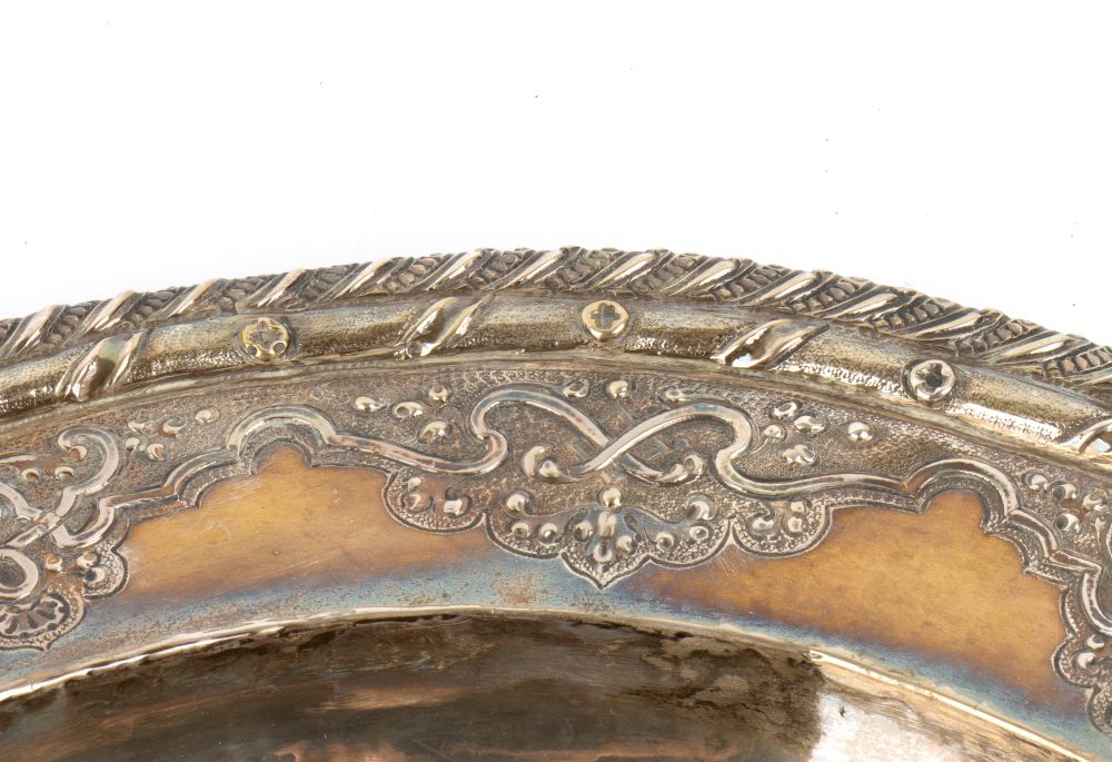di forma ovale realizzato a sbalzo e cesello, caratterizzato da una superficie ampia e lucida, circondata da una tesa riccamente lavorata. Il bordo presenta un motivo con un decoro continuo di volute, racemi floreali e un bordo esterno a cordoncino. Al centro un medaglione ovale in leggero rilievo finemente decorato a motivi fitomorfi o a volute.