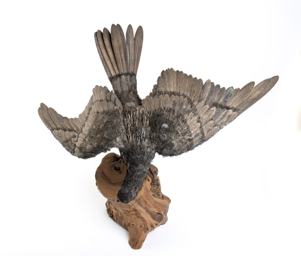 reso in maniera espressionistica e dettagliata: il corpo è formato da fitti filamenti o fibre metalliche, che simulano un piumaggio denso e scuro. Le grandi ali sono aperte e realizzate con lamine in argento lisce che imitano le penne remiganti, creando un notevole contrasto tattile e visivo. La figura poggia con gli artigli su un tronco in legno.