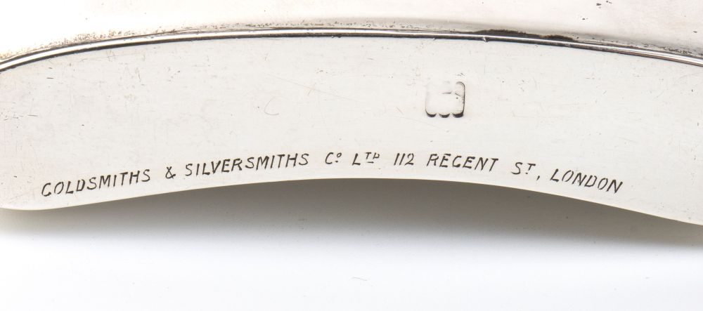 1 - Fiaschetta di forma squadrata ma con un corpo leggermente bombato, che presenta una fascia decorativa centrale. Londra 1915-1916, argentiere Goldsmiths & Silversmiths Co Ltd;