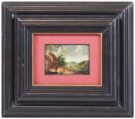 SCUOLA FIAMMINGA DEL XVIII SECOLO Paesaggio fluviale con personaggi olio su carta applicata a cartoncino, in cornice cm 7x10 FLEMISH SCHOOL OF 18TH CENTURY RIVER LANDSCAPE WITH FIGURES, OIL ON PAPER LAID ON CARDBOARD