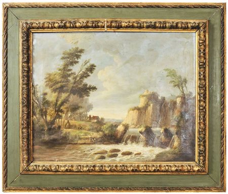 PAESAGGIO FLUVIALE CON PESCATORE E VIANDANTE XIX secolo olio su tela, in cornice, difetti cm 60x75 RIVER LANDSCAPE WITH FISHERMAN AND TRAVELLER, 19TH CENTURY, OIL ON CANVAS