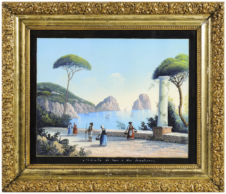 VEDUTA DI CAPRI E DEL FARAGLIONE gouache su carta, in cornice cm 42x52 VIEW OF CAPRI AND FARAGLIONE, GOUACHE ON PAPER
