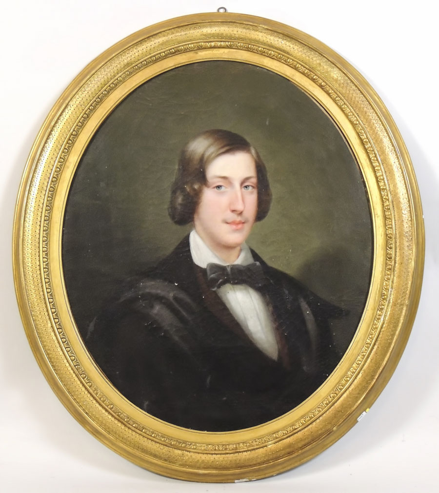 SCUOLA INGLESE DEL XIX SECOLO Ritratto di giovane gentiluomo olio su tela in ovale, in cornice cadute di colore cm 74x61,5 ENGLISH SCHOOL OF 19TH CENTURY, PORTRAIT OF A YOUNG MAN, OIL ON ONVAL CANVAS