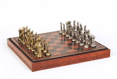 SCACCHIERA IN CUOIO pedine in metallo raffiguranti personaggi napoleonici...