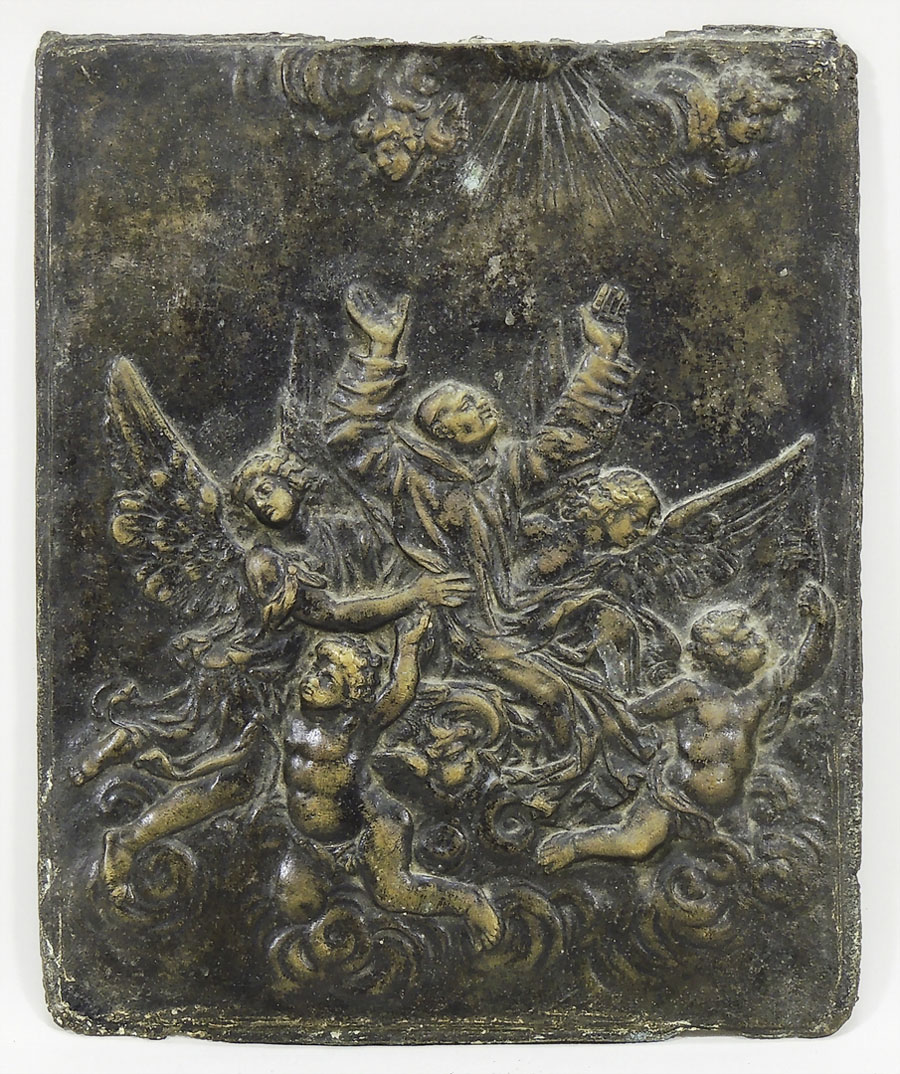 PLACCA A BASSORILIEVO IN BRONZO raffigurante Santo in gloria con angeli cm 31,5x25,5 BRONZE LOW-RELIEF PLAQUE