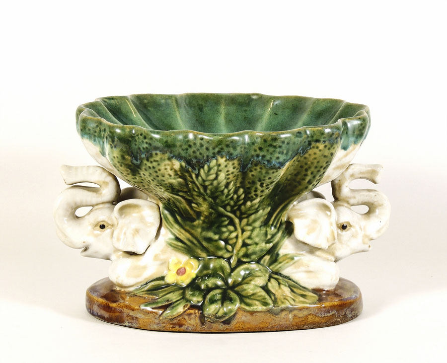 ALZATINA IN CERAMICA POLICROMA coppetta baccellata sorretta da coppia di elefantini, base ovale h cm 18 PAINTED CERAMIC PEDESTAL BOWL