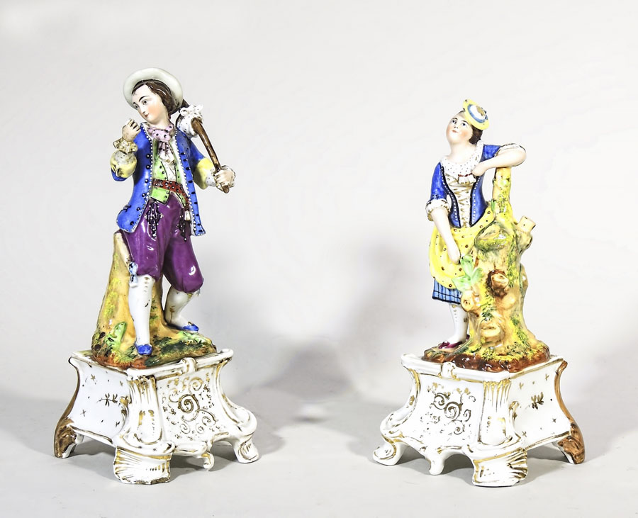 COPPIA DI FIORIERE IN PORCELLANA POLICROMA Francia, XIX secolo modellate come due fanciulli, su basi sagomate lumeggiate in oro, alcuni difetti h cm 27 e cm 31 PAIR OF PAINTED PORCELAIN VASES, FRANCE, 19TH CENTURY