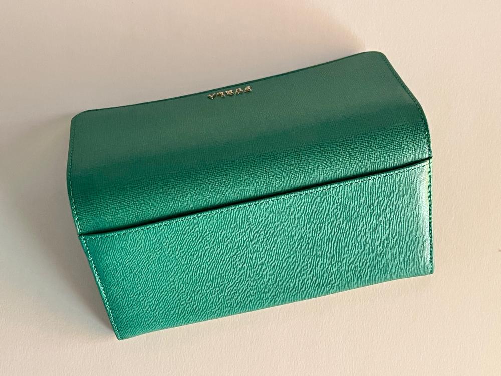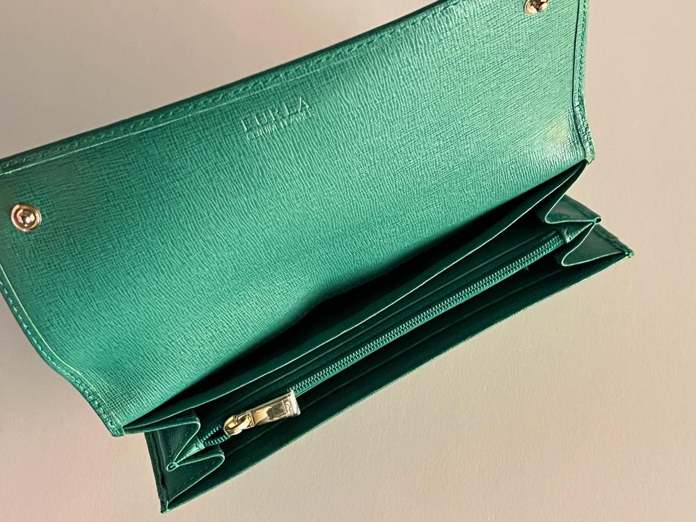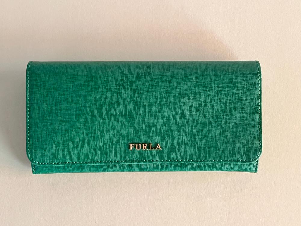 Furla Babylon XL Bifold Wallet in Emerald. Two note compartments, twelve card slots, three flat pockets and one middle zip-compartment for loose change characterize the Furla Babylon. One additional pocket is available at the back of this leather wallet. The flap of this women's wallet with metal lettering is snap-secured. Brand new with tags in original box with dustbag