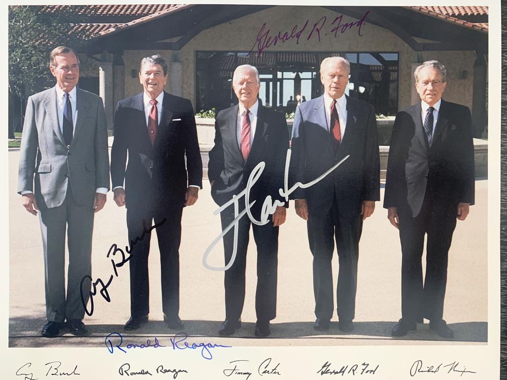 Four Presidents signed photo autographed by George H. W. Bush, Ronald Reagan, Jimmy Carter, Gerald Ford and . 8x10 inches. GFA Authenticated