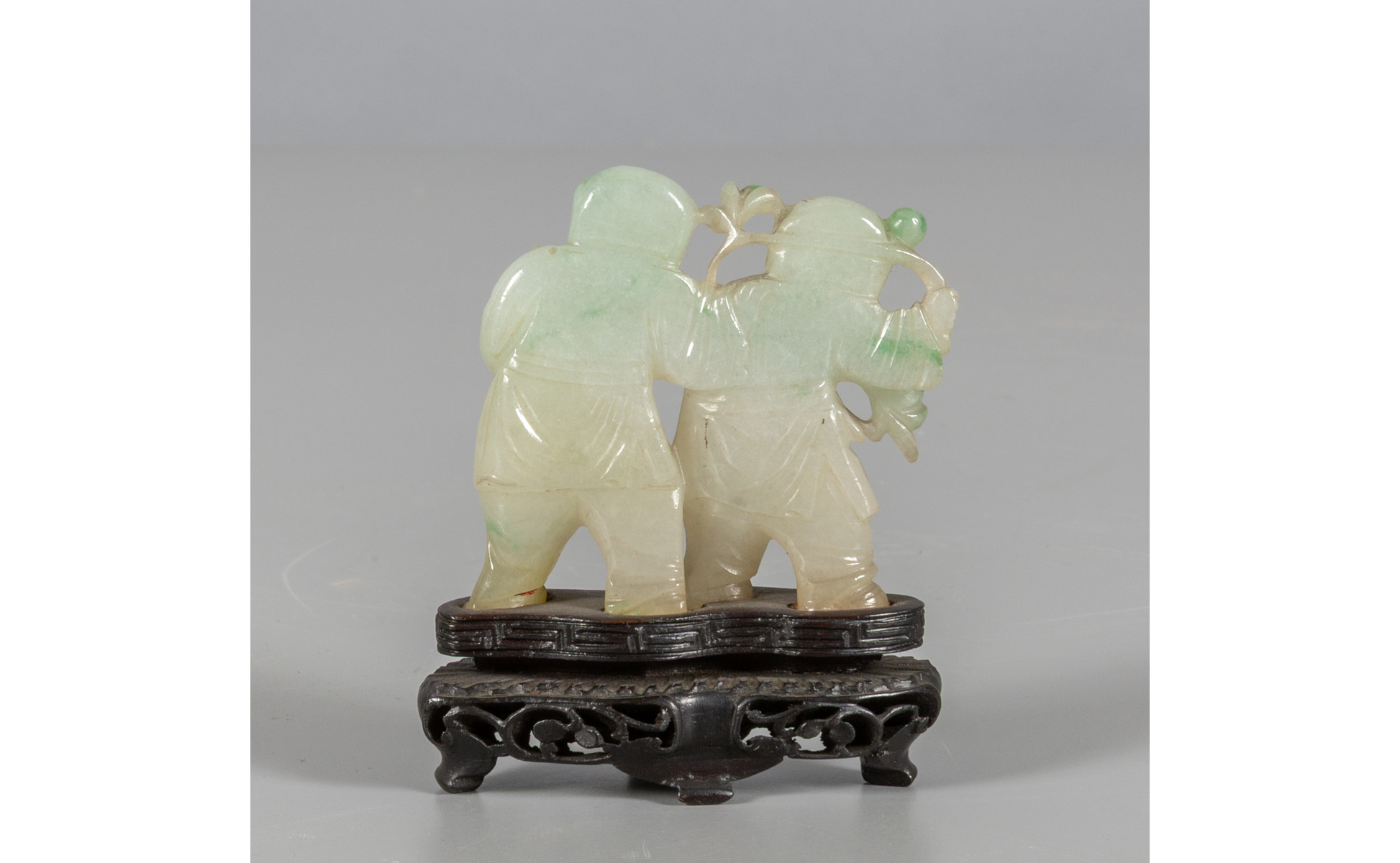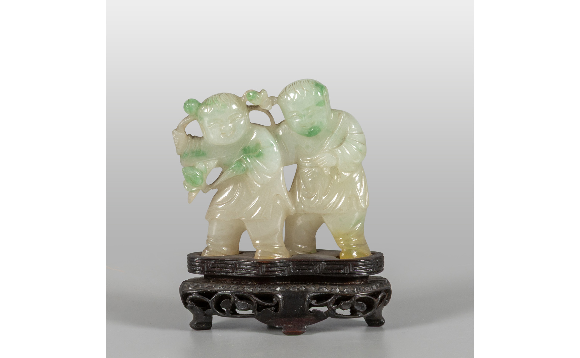 Due bambini cinesi in giadeite basi in legno Cina sec.XX