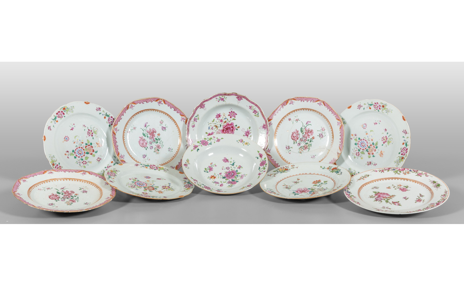 Dieci piatti di forme diverse decorati in policromia di fiori su fondo bianco