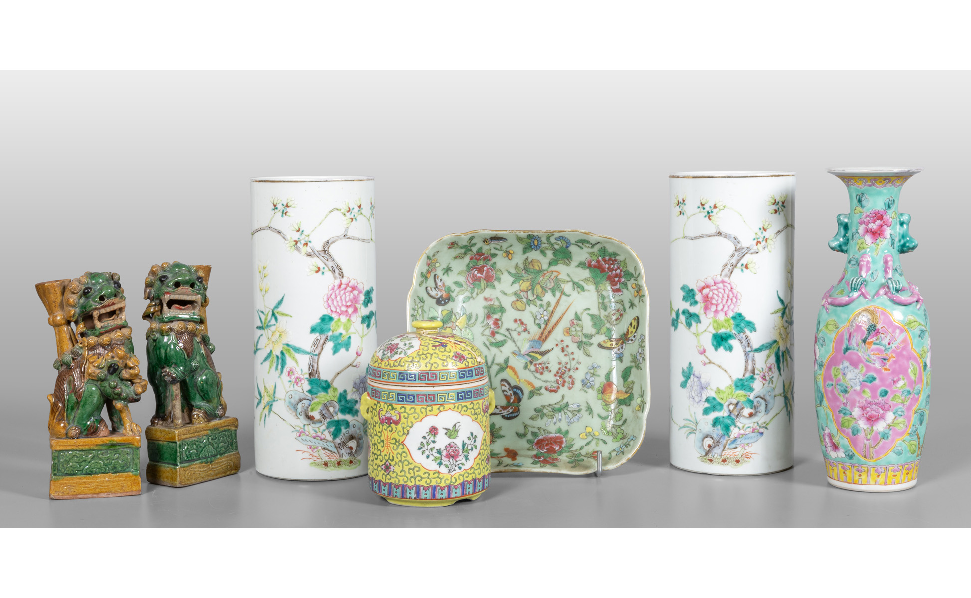 Coppia di vasi a cilindro in porcellana bianca con fiori policromi (h.cm.29) due cani di Pho (h.cm.21) e un vasetto una scatola e piatto in porcellana