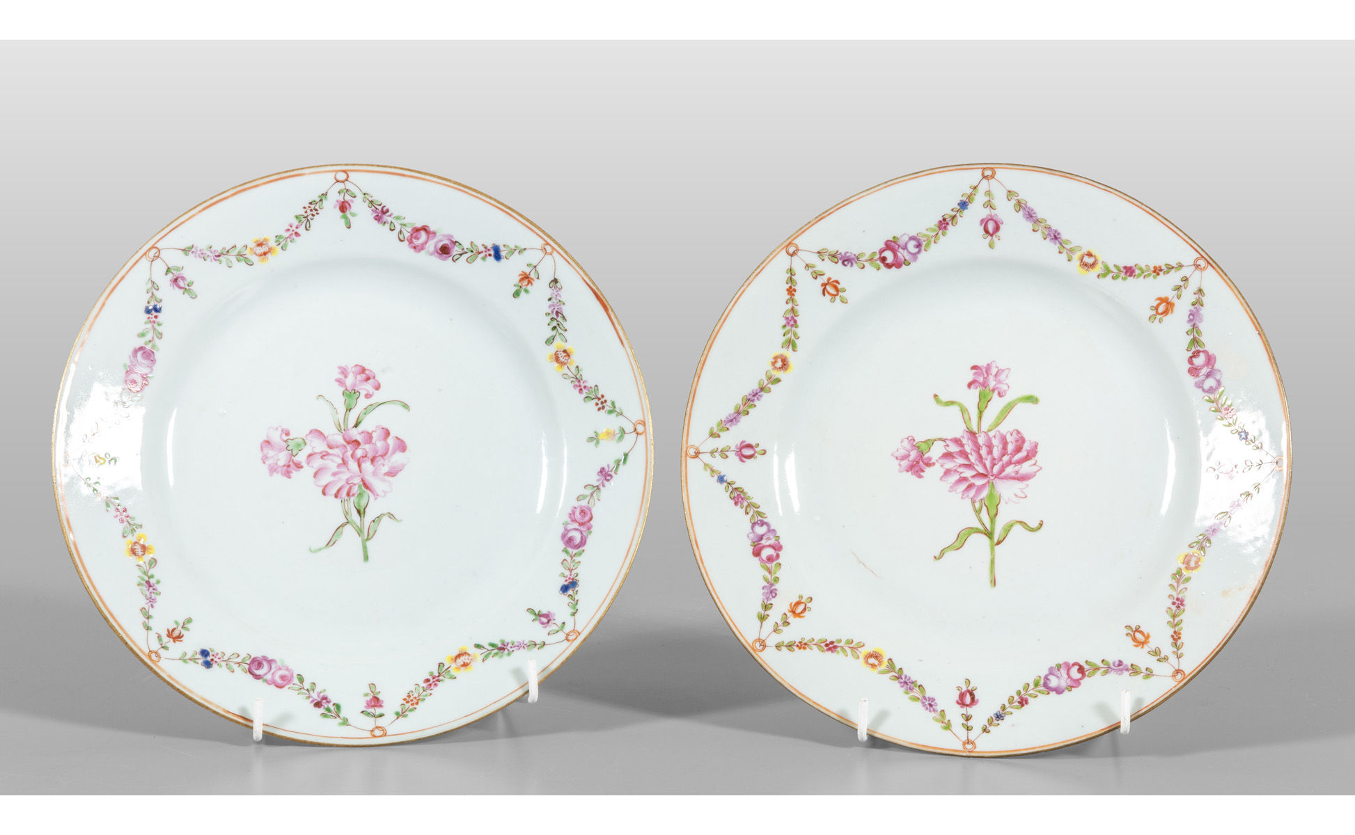 Coppia di piatti in porcellana decorati in policromia su fondo bianco Cina sec.XVIII