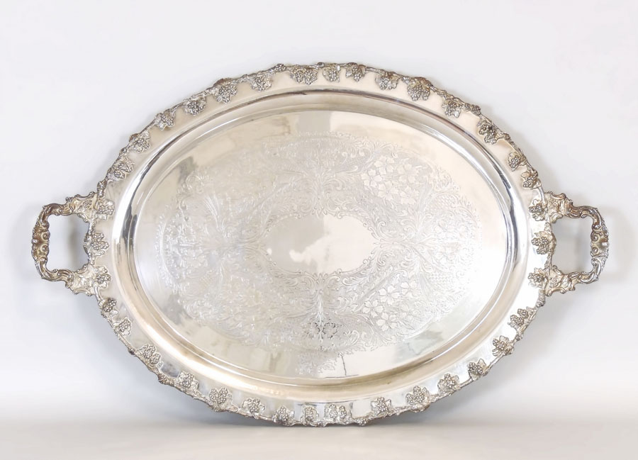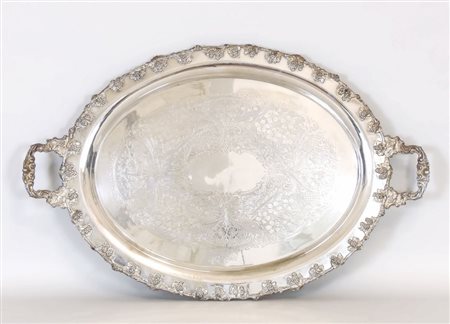 GUANTIERA OVALE IN SHEFFIELD bordo sbalzato con fiori, e grappoli d'uva, fondo riccamente cesellato con motivi floreali, vegetali e volute, quattro piedini a ricciolo cm 78x49 OVAL SHEFFIELD TRAY