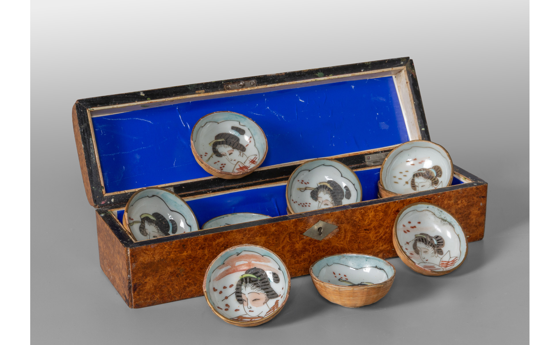 Scatola contenente servizio da sake per dodici in porcellana e paglia Giappone sec.XIX