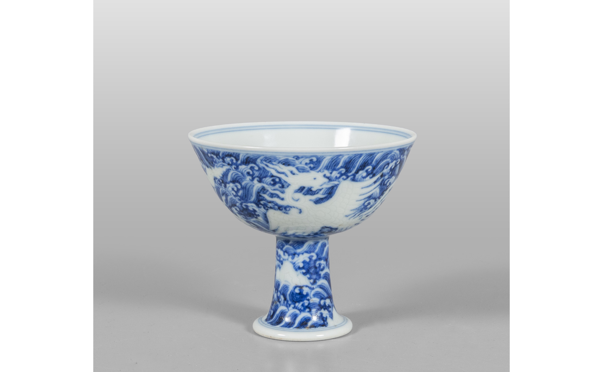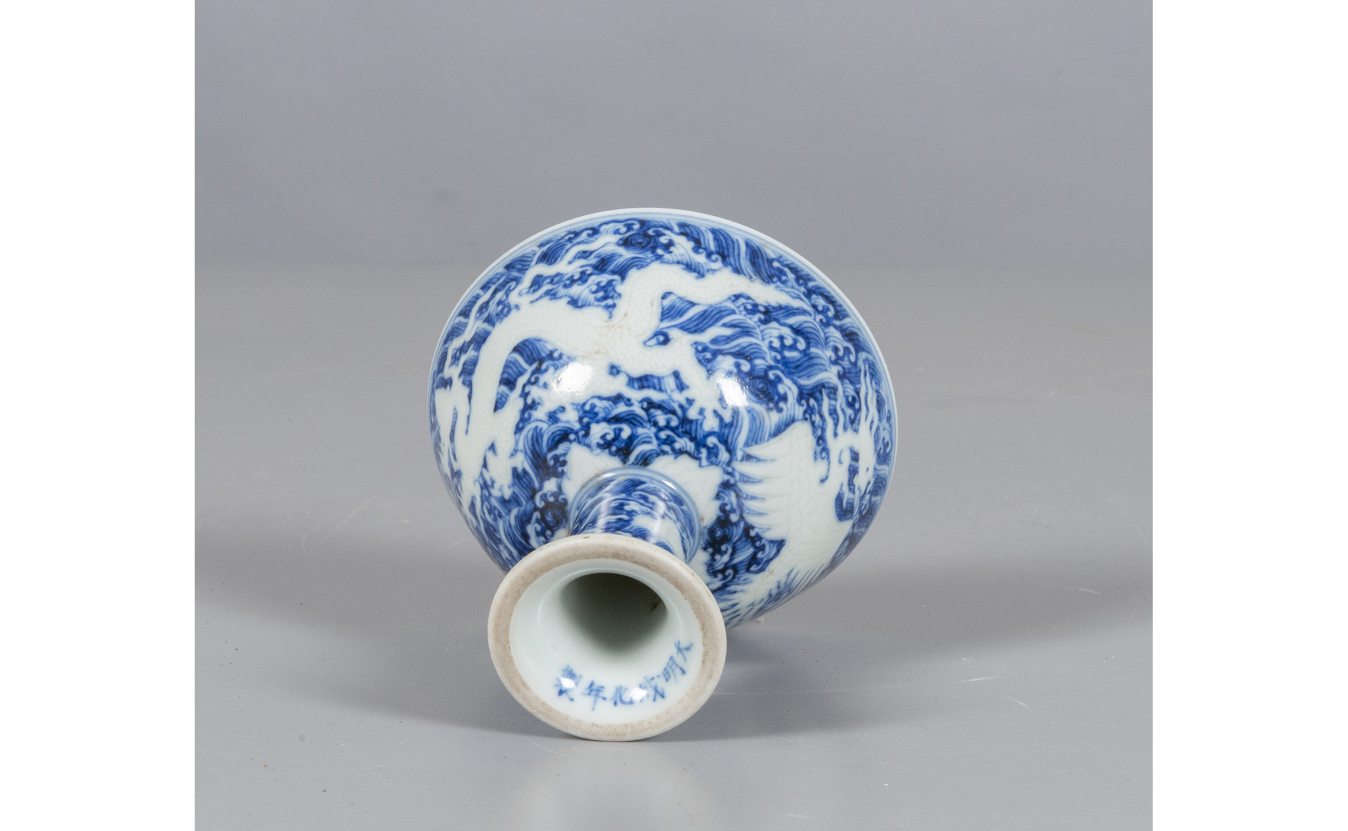 Coppa a stelo in porcellana bianca e blu decorata con fenice e dragone a cinque unghie