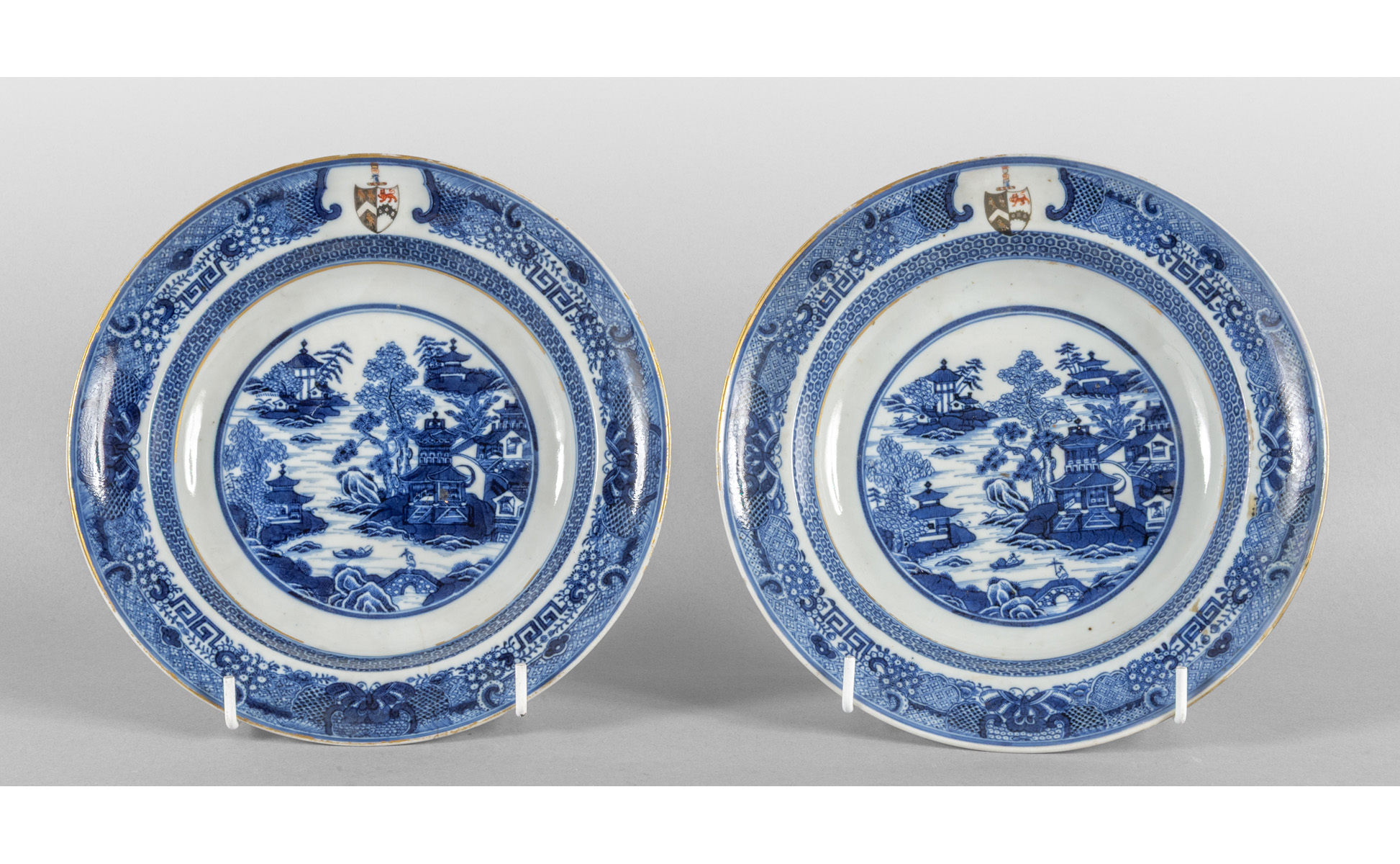 Coppia di piatti in porcellana bianca e blu decorata a paesaggi con stemma in policromia Cina sec.XIX