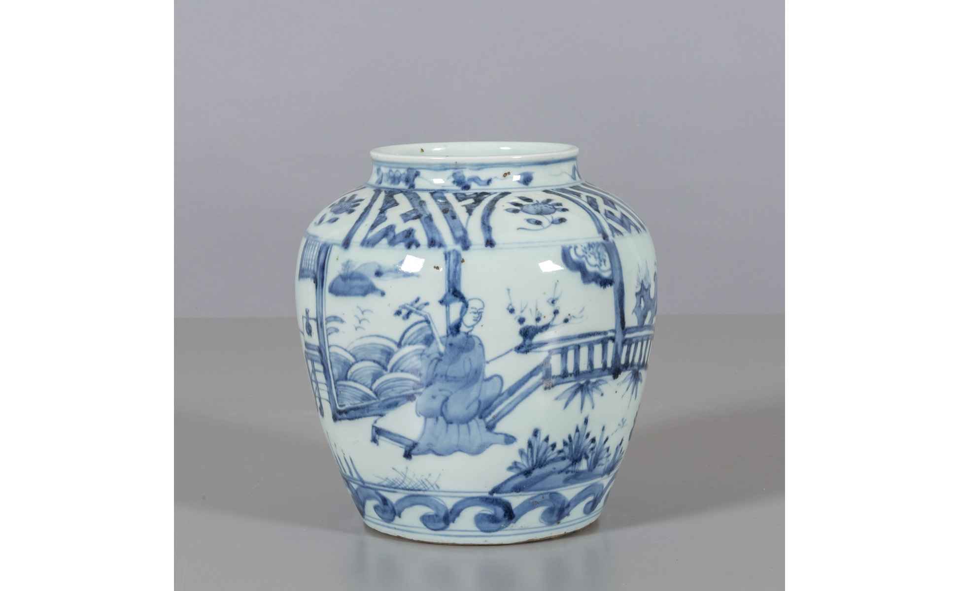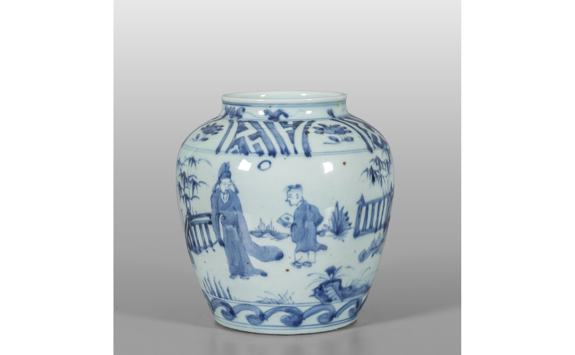 Vaso in porcellana decorato in bianco e blu con maestro e fanciullo Cina sec.XIX