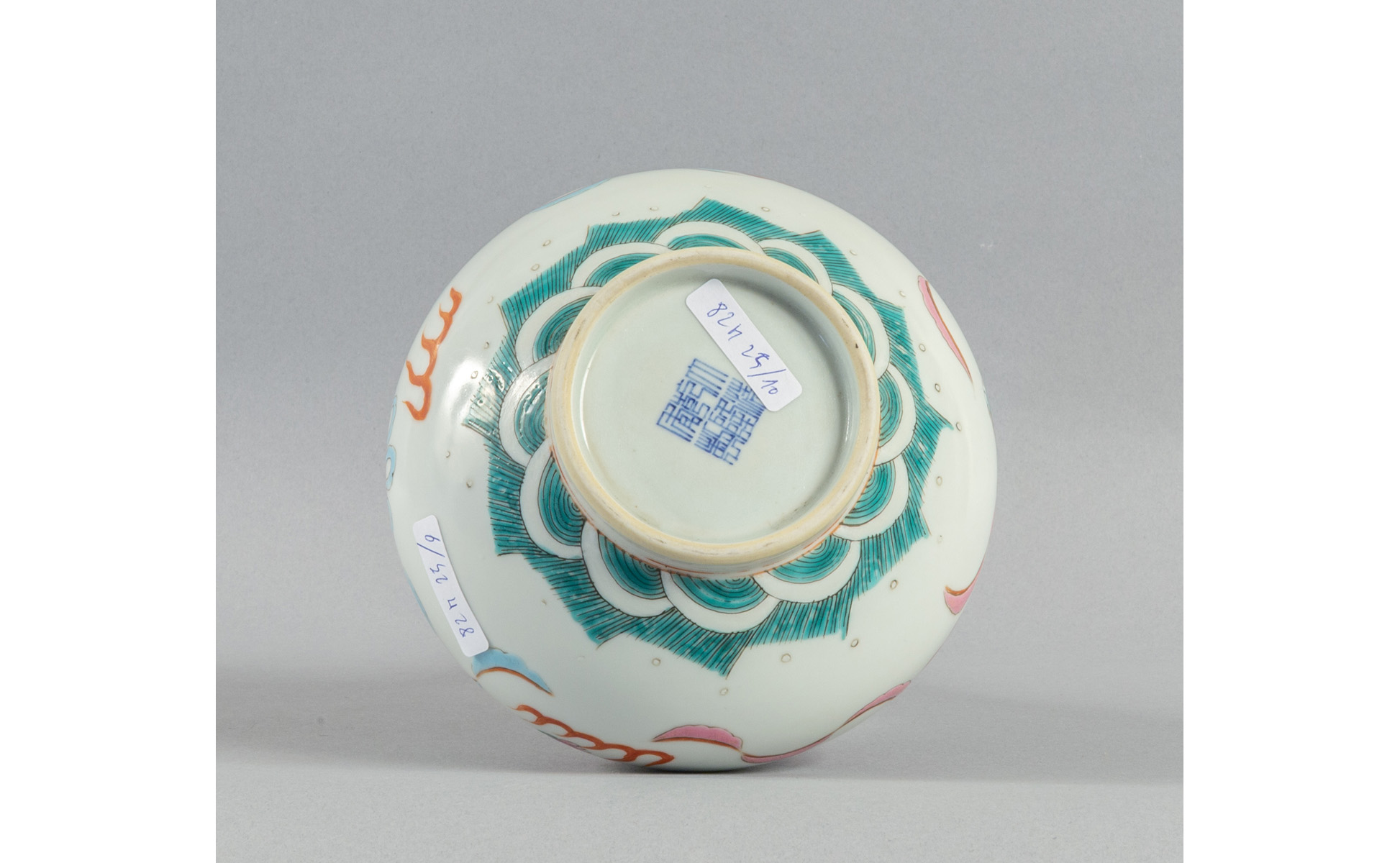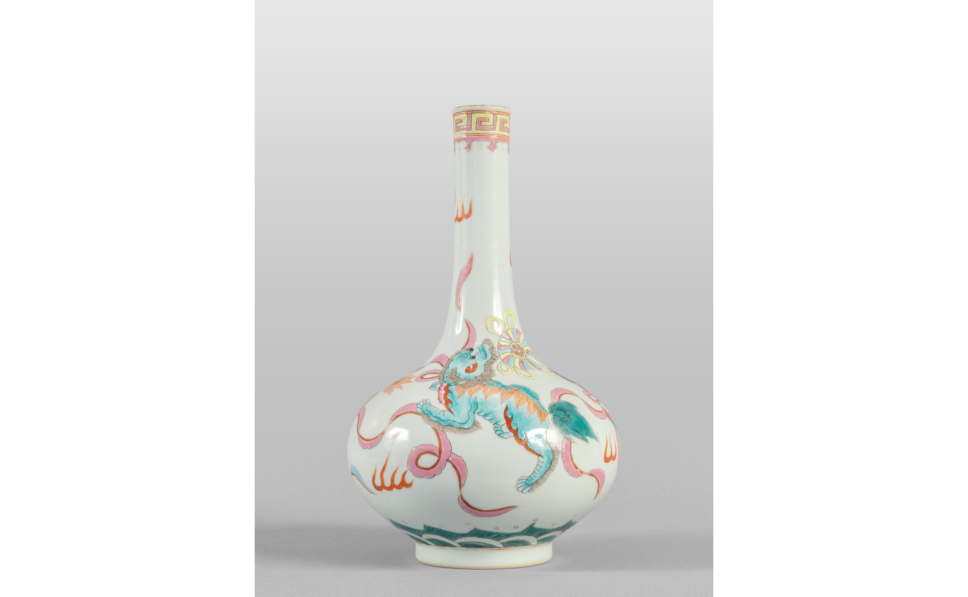 Vaso a collo lungo in porcellana decorata in policromia con kilin marcato alla base Cina