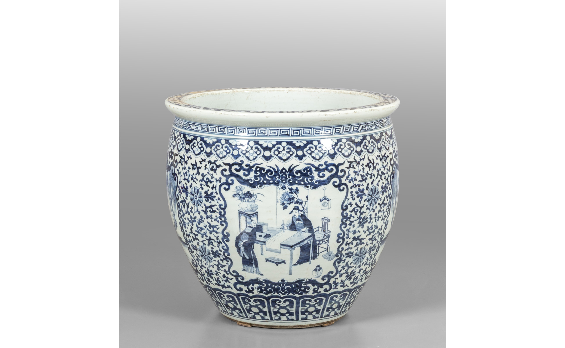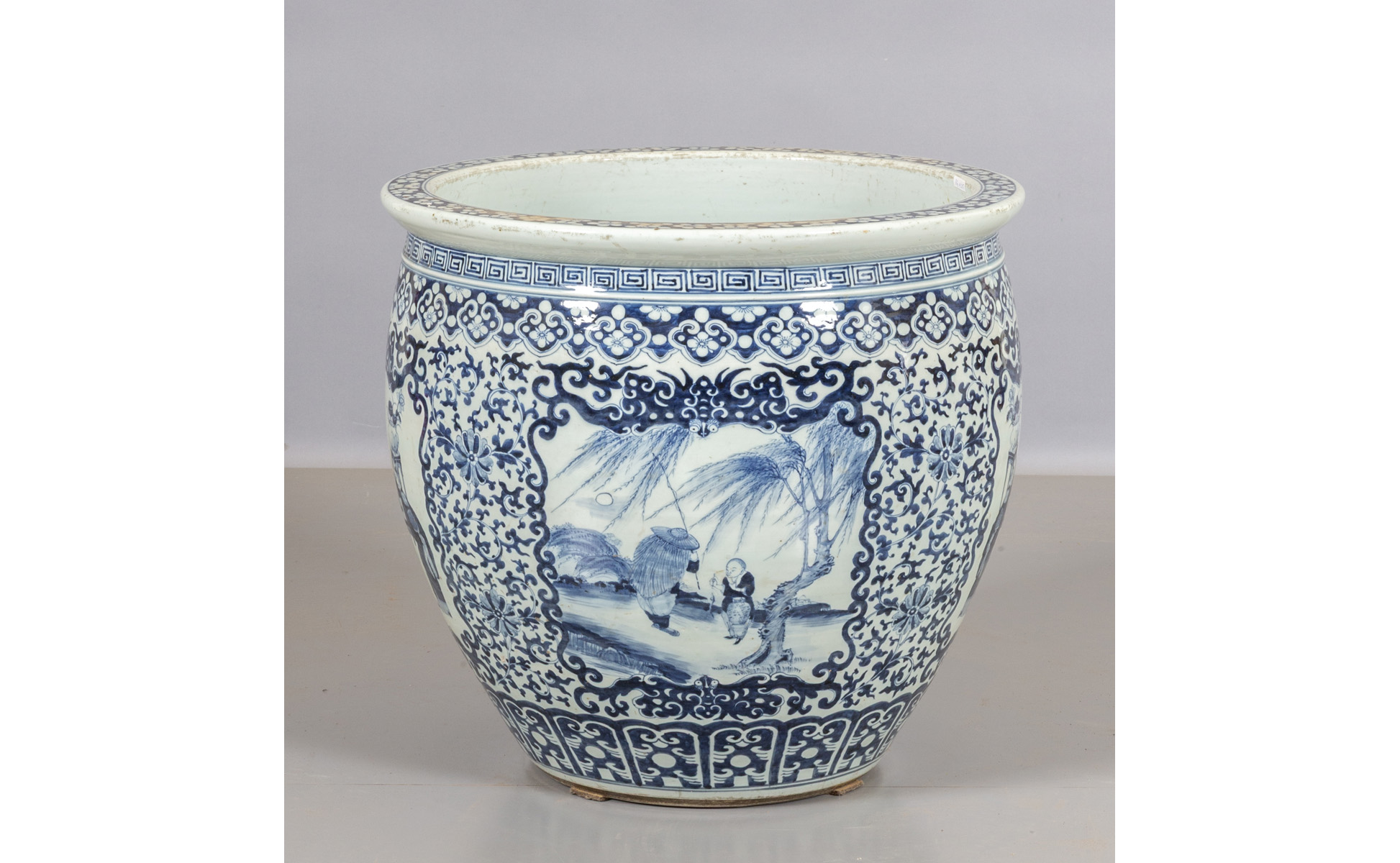 Grande cachepot in porcellana bianca e blu decorato con scene di vita orientale Cina sec.XIX
