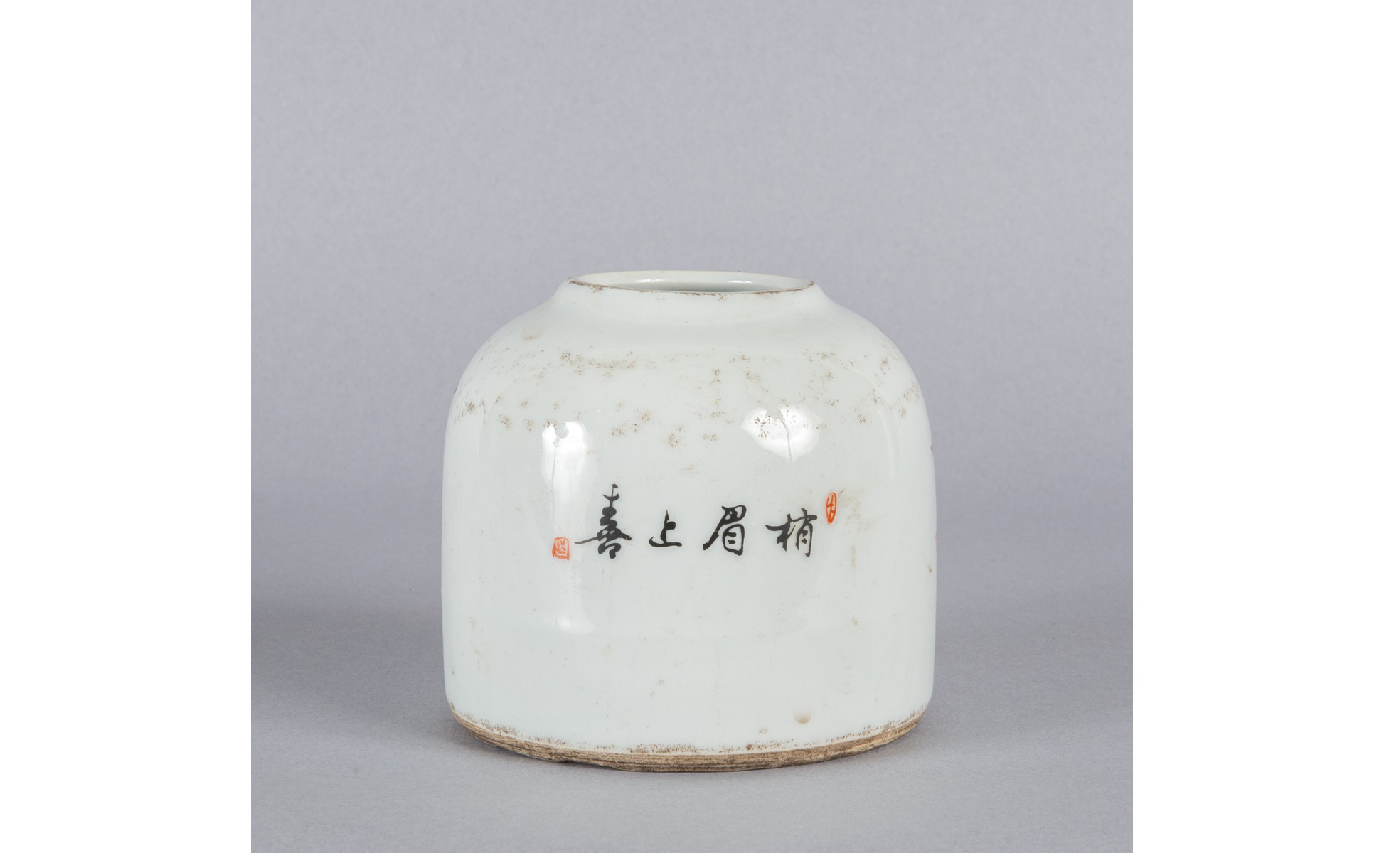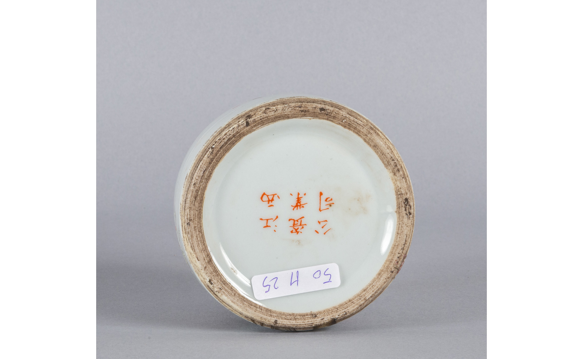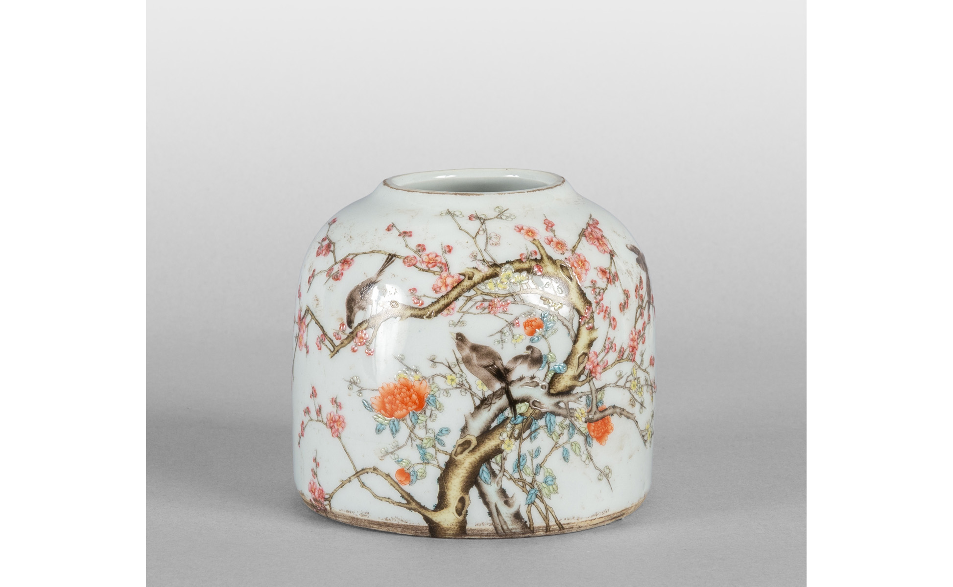 Contenitore in porcellana decorato in policromia con fiori e uccelli marcato alla base Cina sec.XIX