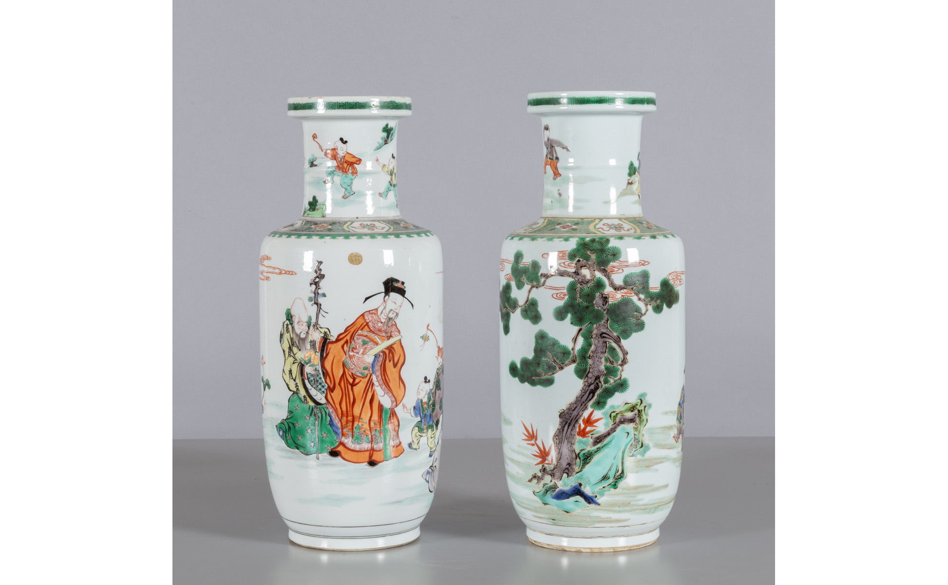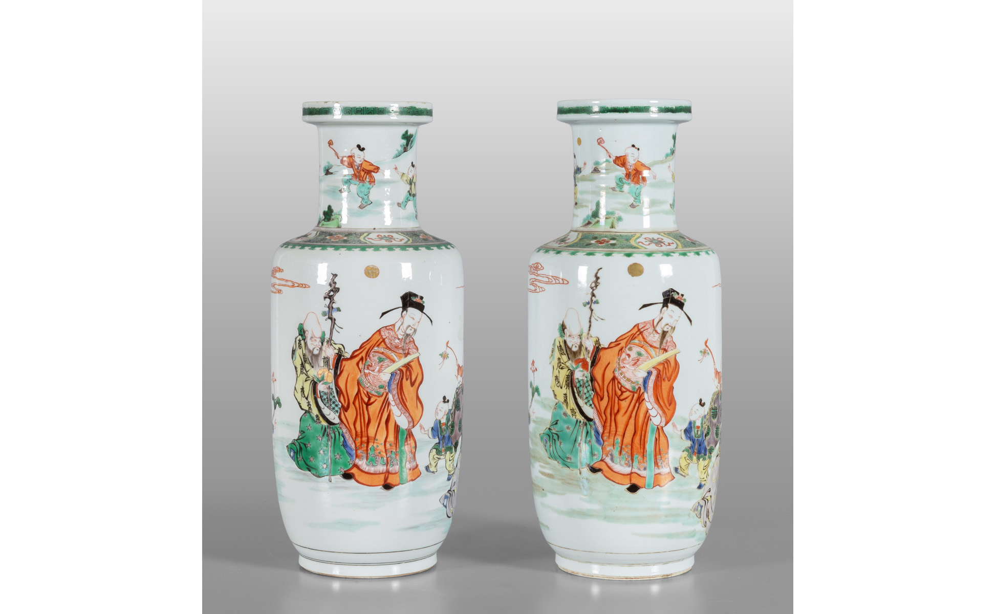 Coppia di vasi in porcellana famiglia verde decorati con dignitari e bambini marcati alla base con il doppio cerchio Cina sec.XIX