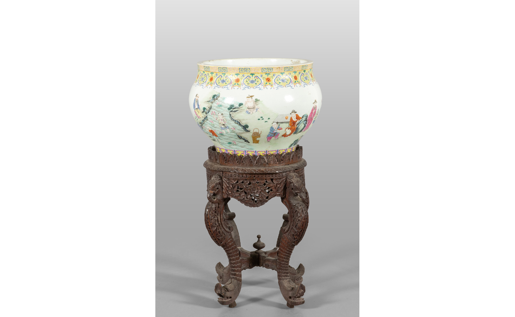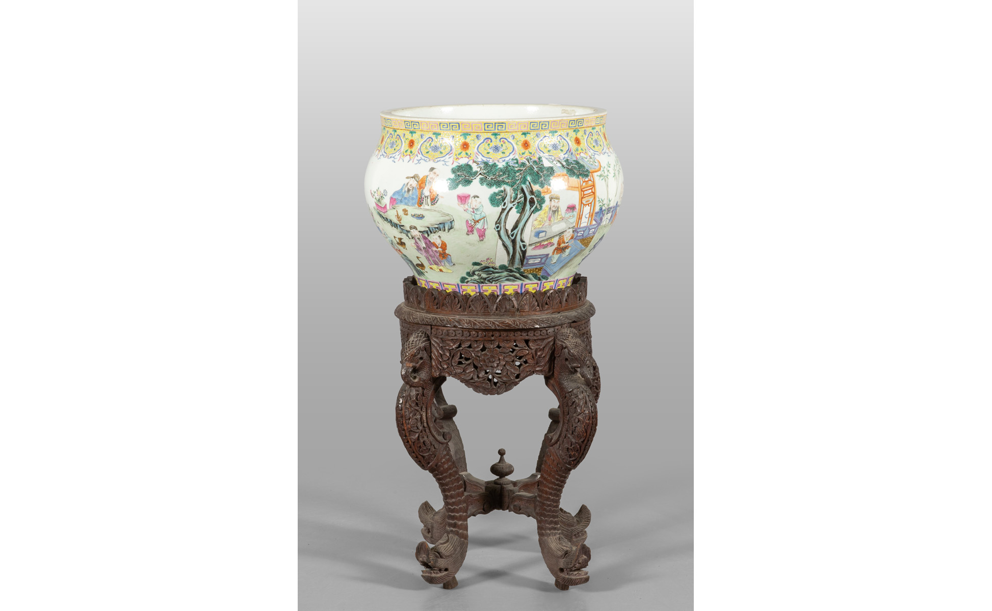 Cachepot decorato in policromia in porcellana a figure di saggi con bambini poggiante su base in legno intagliato Cina sec.XIX