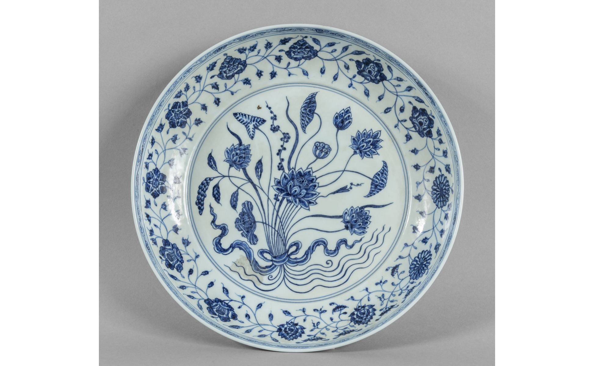 Grande piatto in porcellana a decorazione bianca e blu a fiori Cina sec.XIX