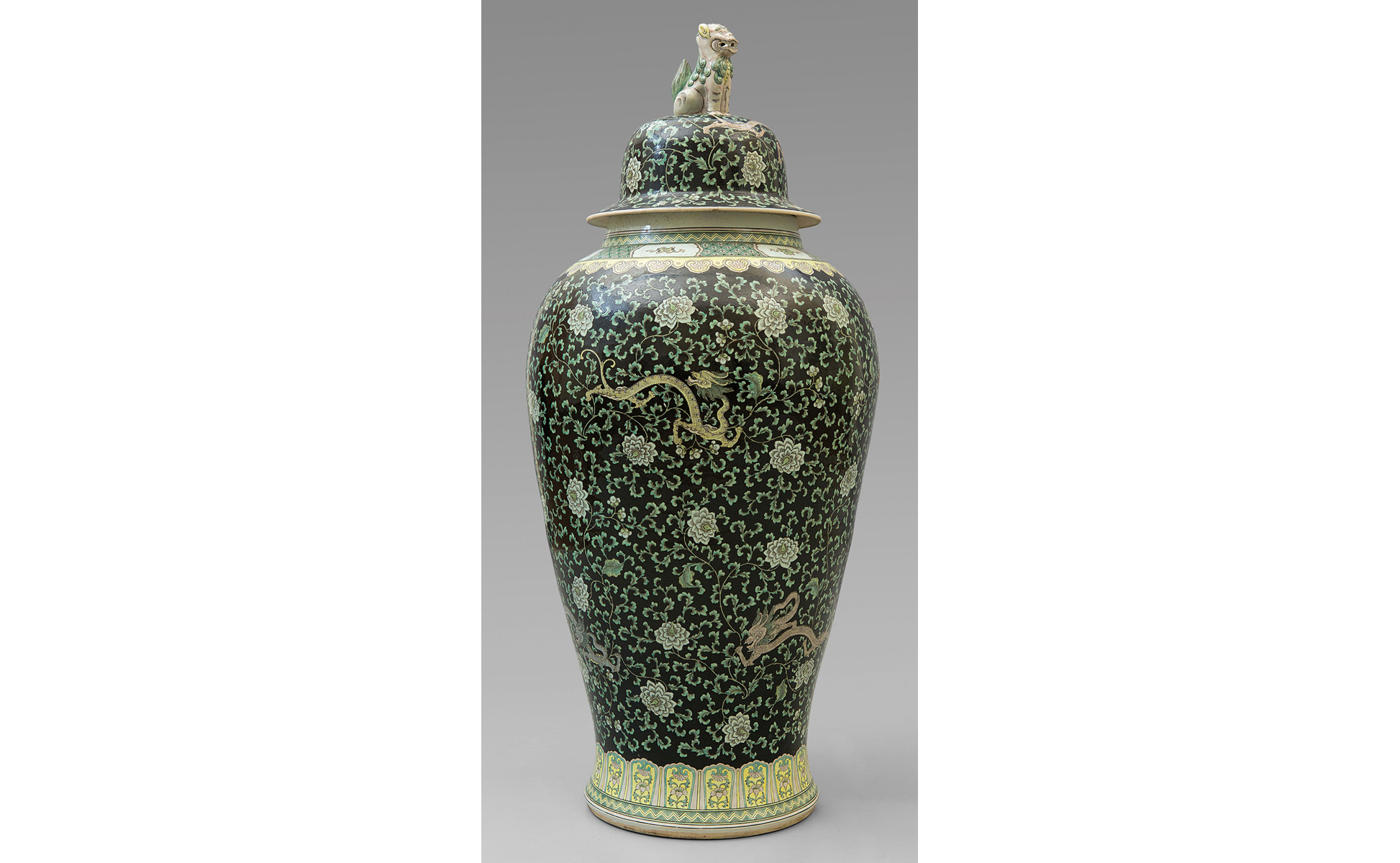 Grande vaso con coperchio in porcellana famiglia Nera decorato con draghi e fiori di garofano marcato alla base Cina sec.XX