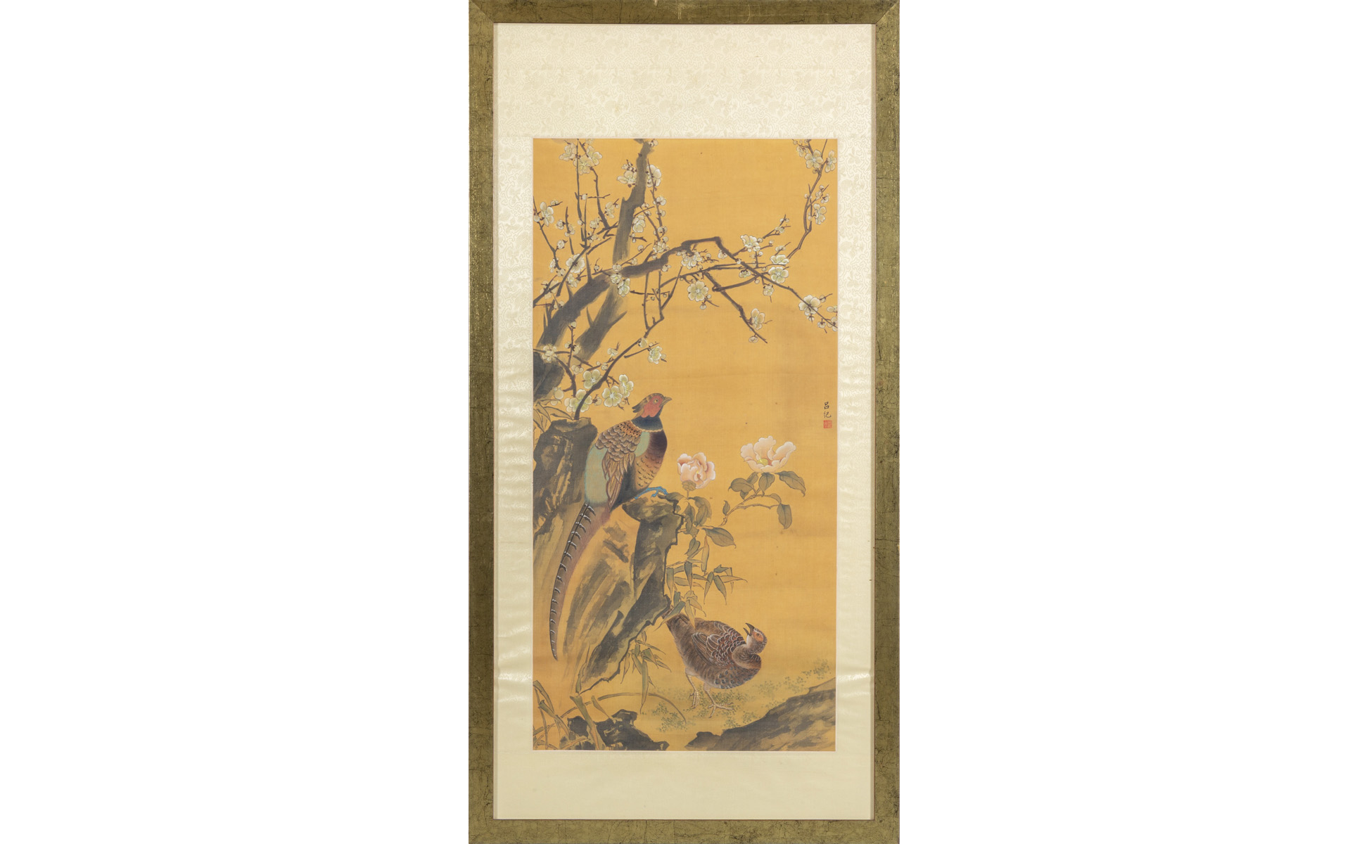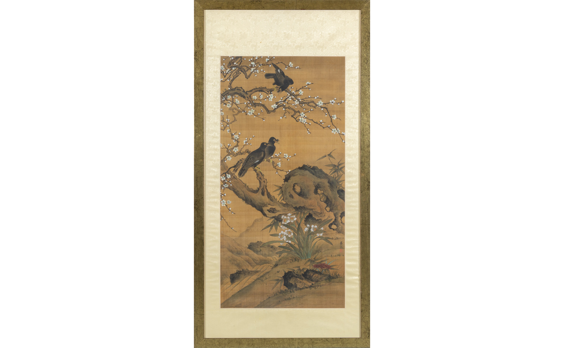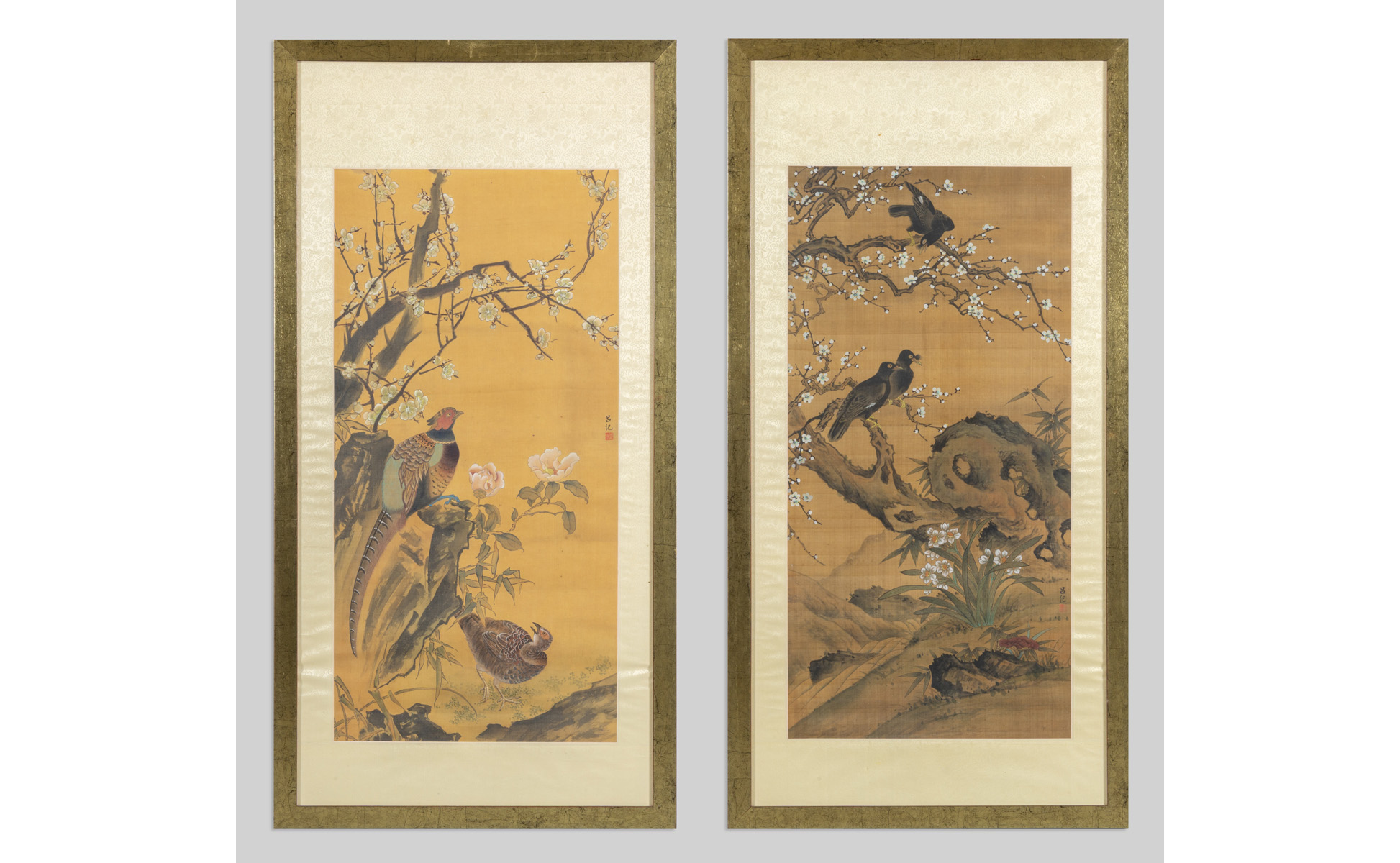 Coppia di pannelli dipinti su seta con volatili e tralci di ciliegio Cina sec.XIX