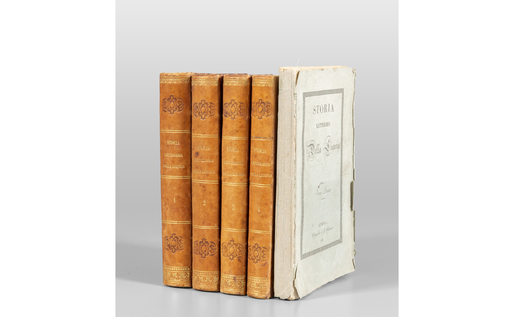 Cinque voll. in-8°; i primi quattro rilegato in mezzo vitello d'epoca il quinto in brossura editoriale con dorso rifatto. Eccellente stato complessivo del testo.