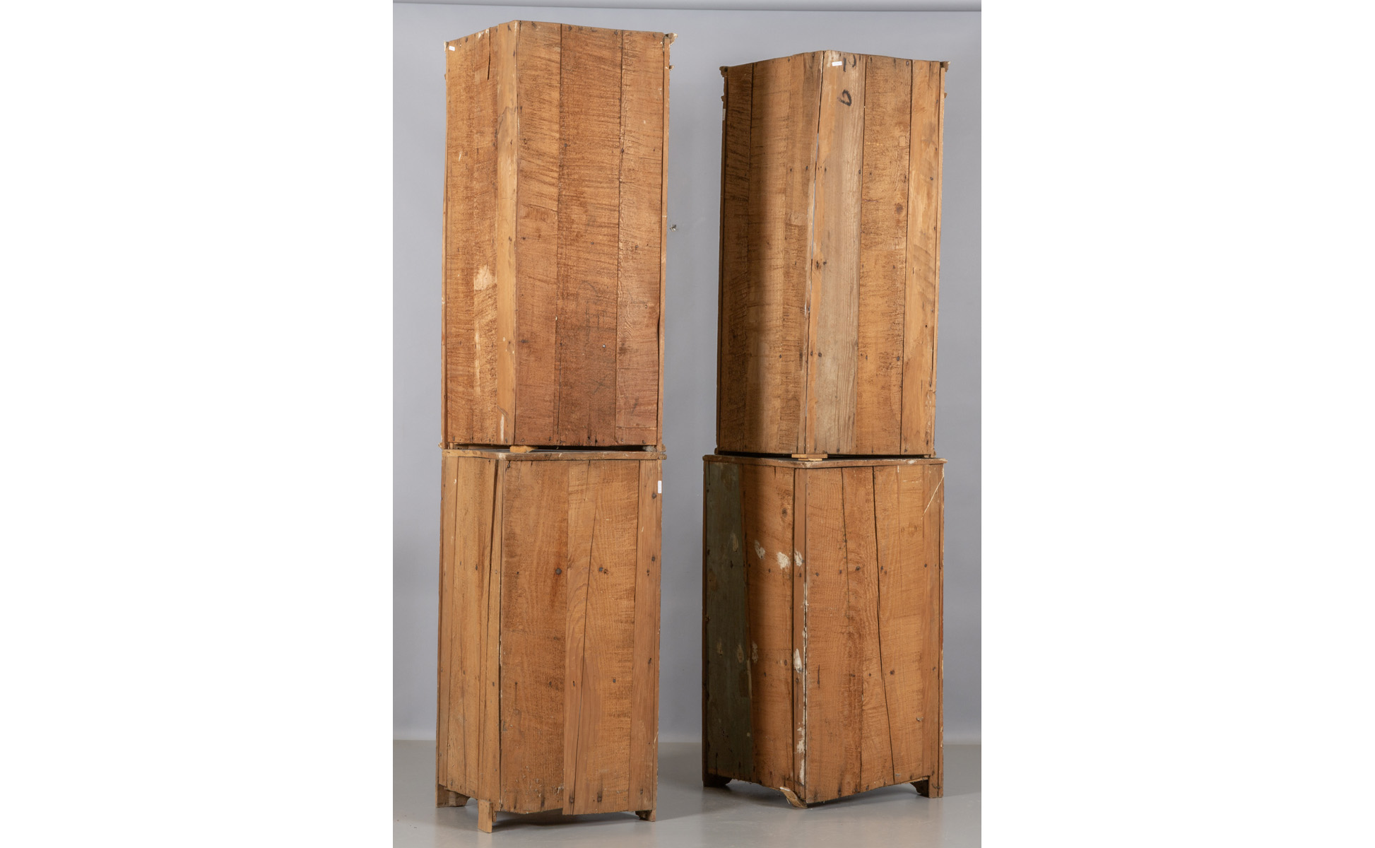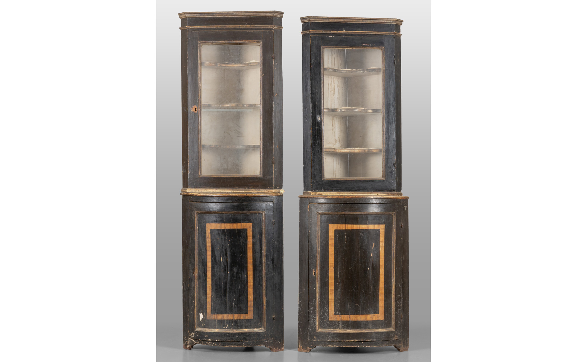 Coppia di cantonali in legno laccato parte inferiore con sportello parte superiore a vetrina apribile sec.XVIII